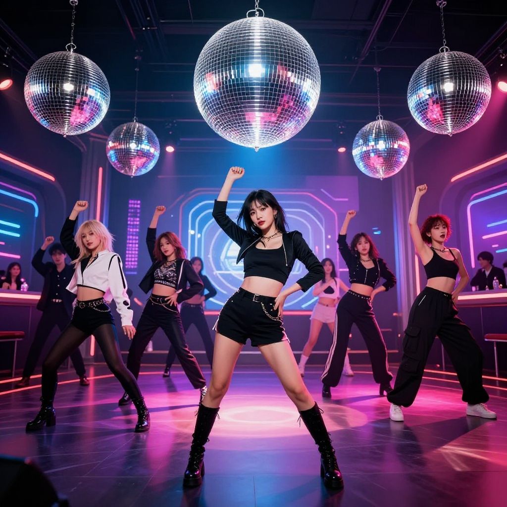 Photograph of a vibrant, energetic dance performance on a dark stage. Six dancers, three men and three women, wear black tops and pants with bold logos, and one woman in a red jacket and pants. They strike dynamic poses with arms extended and legs apart, surrounded by colorful stage lights—blue, red, and purple. A DJ stands behind them, visible through the mist, with a large screen displaying a white logo in the background. The floor reflects the stage lights, enhancing the lively atmosphere. The dancers appear focused and synchronized, embodying a high-energy, modern dance style.