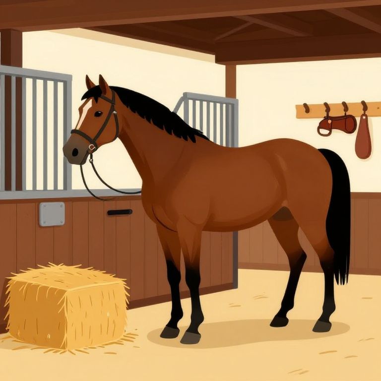 Digital illustration of a brown horse with black mane and tail, standing in a wooden stable with hay bale, bridle, and saddle on the wall