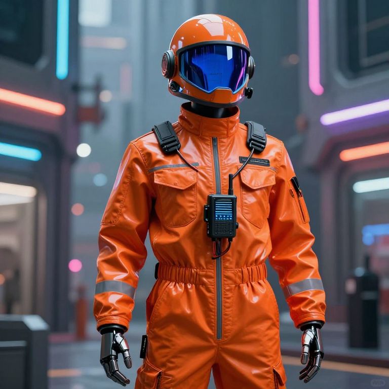 A detailed mannequin standing in a futuristic urban setting, wearing an orange jumpsuit with reinforced stitching and reflective panels, equipped with a helmet that features a glowing blue visor and ventilation vents, and a sophisticated radio system attached to its chest with exposed wires and digital readouts. The mannequin has a sleek, humanoid form with smooth, reflective surfaces, and its limbs are articulated with precision, giving it a lifelike yet artificial appearance. The scene is illuminated by neon lights and soft ambient city glow, emphasizing the vibrant orange color of the jumpsuit against the urban backdrop.