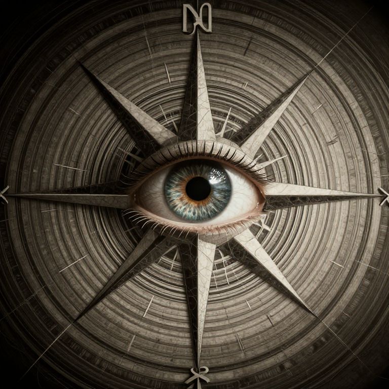 An eternal gaze pierces through the labyrinthine compass, its unyielding eye spinning in endless loops of introspection, weaving cryptic patterns that unravel the unseen threads of existence.