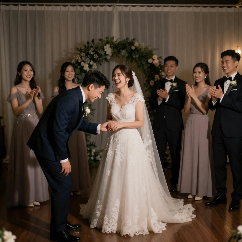 Photograph of a bride in a white, sleeveless, flowing dress dancing down a grand staircase with a group of cheering guests. The staircase has a black, gold-rimmed railing, and the background features ornate, white architectural details. The bride's arms are raised, and she has a joyful expression. Guests wear formal and semi-formal attire, with some holding cameras. Potted plants are on either side of the staircase.