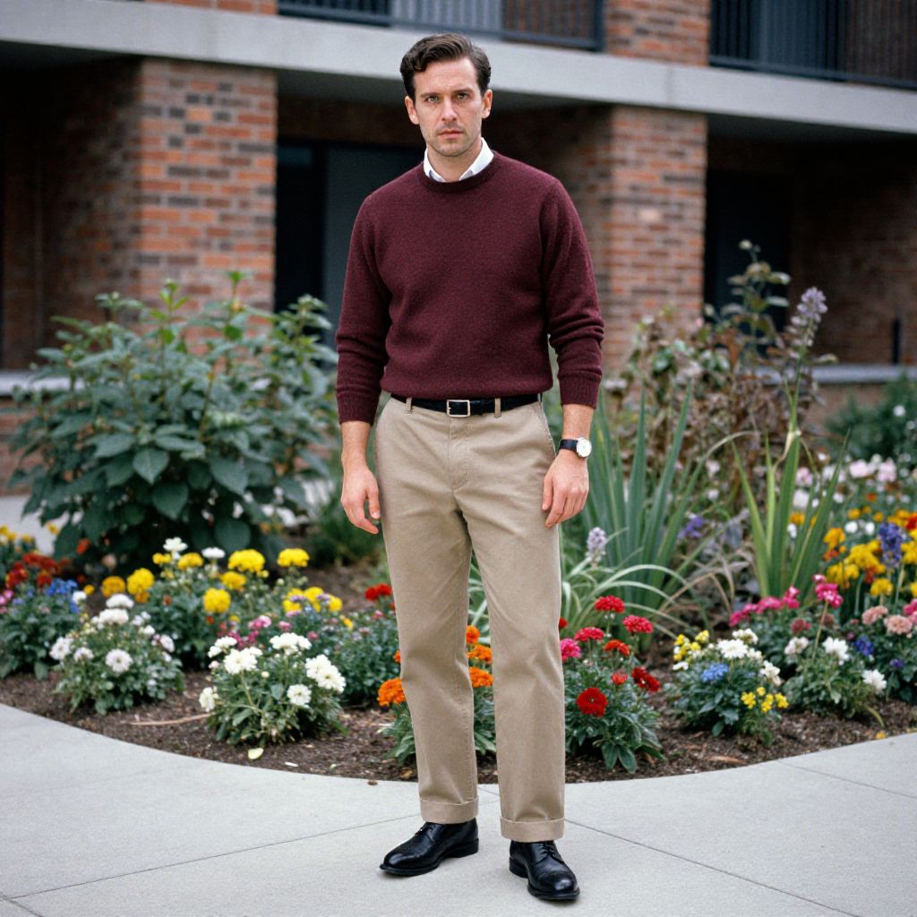 A man, burgundy wool blend sweater, khaki chinos, black leather brogues, matching black leather belt, elegant watch, modern brick facade, lush green courtyard, vibrant flower beds, ektachrome film stock, confident expression, relaxed posture. Man has masculine face and piercing eyes