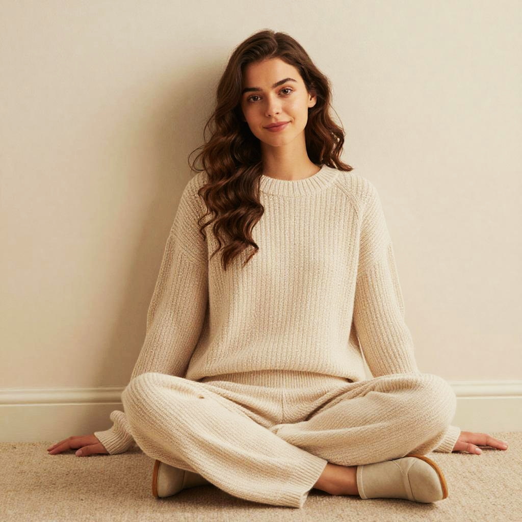 Photograph of a young woman with long, wavy brown hair and light olive skin, sitting cross-legged on a beige carpet against a white wall. She wears a cream-colored, knitted sweater and matching pants, with light beige slip-on shoes. Her expression is calm and slightly smiling. The soft, warm lighting highlights the texture of her sweater and the simplicity of the setting. The overall style is casual and relaxed, with a focus on comfort and natural beauty.