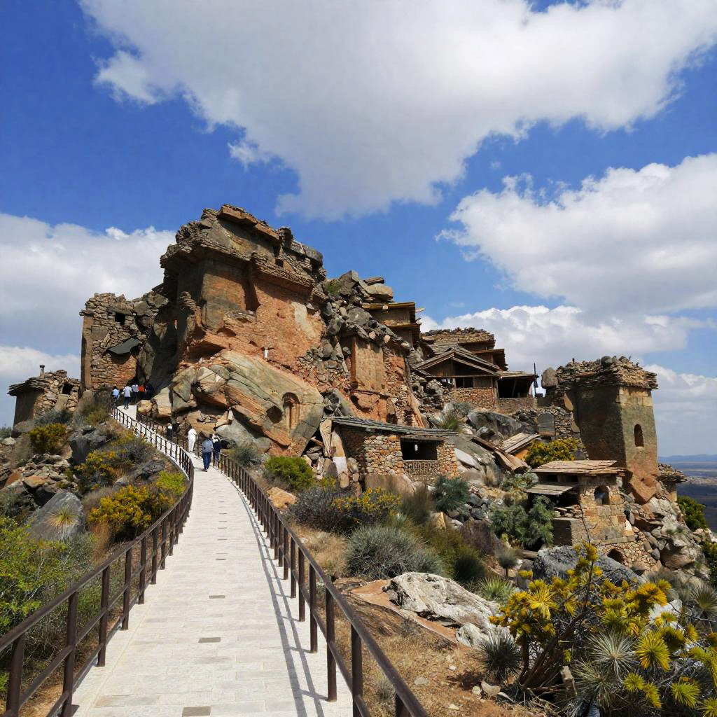 Photograph of an ancient, rocky hilltop with weathered brown stone structures scattered across it. A narrow, white stone pathway with a metal railing winds up from the bottom left, leading to the top. The hill is covered in green and yellow shrubs, and the sky above is bright blue with some white clouds. Small groups of people are walking along the path.