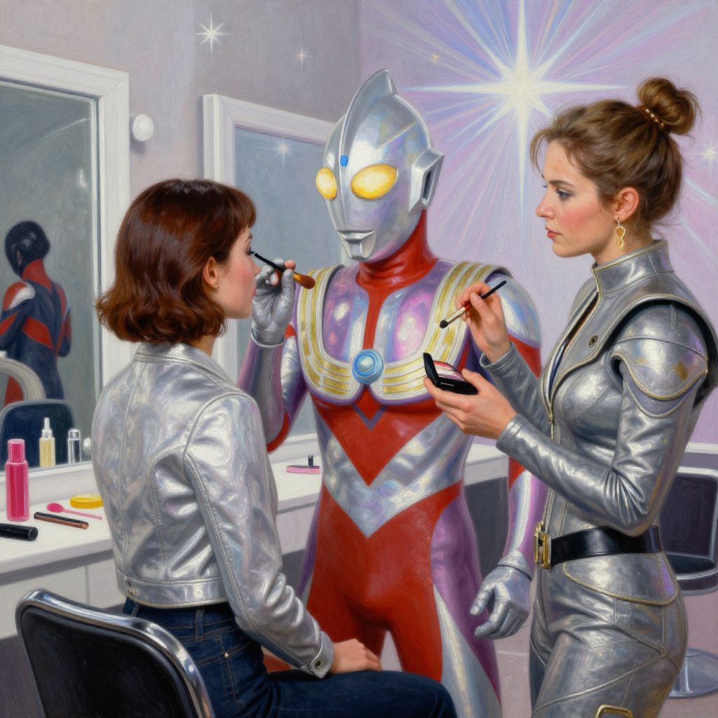 The image is a highly detailed and realistic painting by James Jean and Todd Schorr, featuring elements reminiscent of works by Adrian Ghenie and Henri Rousseau. It depicts a futuristic beauty salon scene with a star wars actress, adorned in a holographic Ultraman suit, applying makeup in front of a mirror. The salon interior is minimalistic, with a focus on the vibrant colors and textures of the characters and their attire. The makeup artist, dressed in a futuristic, metallic outfit, is positioned to the right, holding a makeup brush and a compact. The background features a radiant, starburst effect, adding a magical and surreal atmosphere to the scene. The overall composition is dynamic, with the characters interacting in a harmonious yet complex manner, creating a sense of depth and perspective. The image is rich in detail, with a blend of realistic and fantastical elements, evoking a sense of wonder and intrigue.
