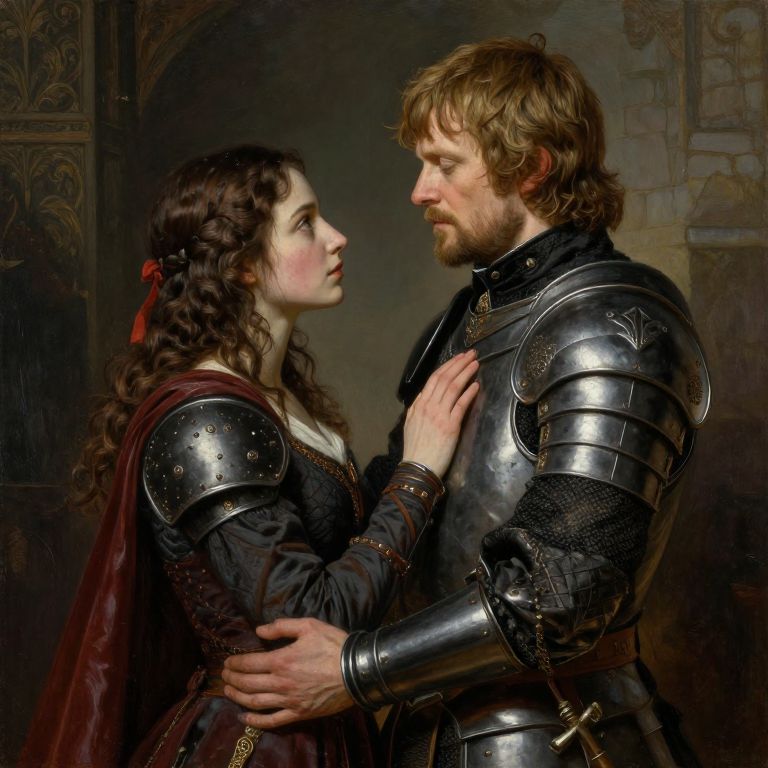 A digitally rendered, realistic painting depicts a medieval couple. The woman, with long, wavy brown hair and fair skin, wears a black dress with metallic shoulder armor and a maroon cloak. She gazes intently at the man, her hand gently touching his chest. The man, with light brown, wavy hair and a beard, wears full black armor with intricate detailing. He looks back at her, his expression serious and focused. The background is dark and indistinct, with subtle medieval architectural elements. The lighting highlights their faces and armor, creating a dramatic, romantic atmosphere.