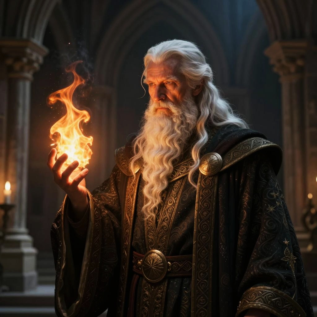 An ultra-detailed fantasy portrait of a wise old man with long white hair and a beard, dressed in ornately decorated robes. He is conjuring a glowing magical flame in his hand, set against the backdrop of an ancient, gothic stone hall illuminated by soft, mystical light. The artwork is rendered in a realistic digital painting style, capturing fine textures and intricate patterns with a high level of fantasy realism.