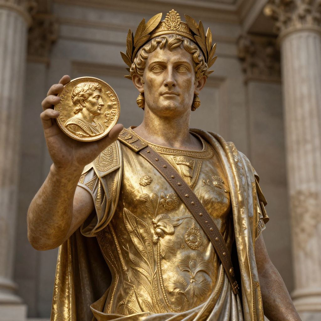 Ancient Roman emperor holding an aureus coin, golden hues reflecting on regal robes and laurel wreath, majestic stone architecture background, dramatic lighting emphasizing wealth and power, digital art with fine texture detail