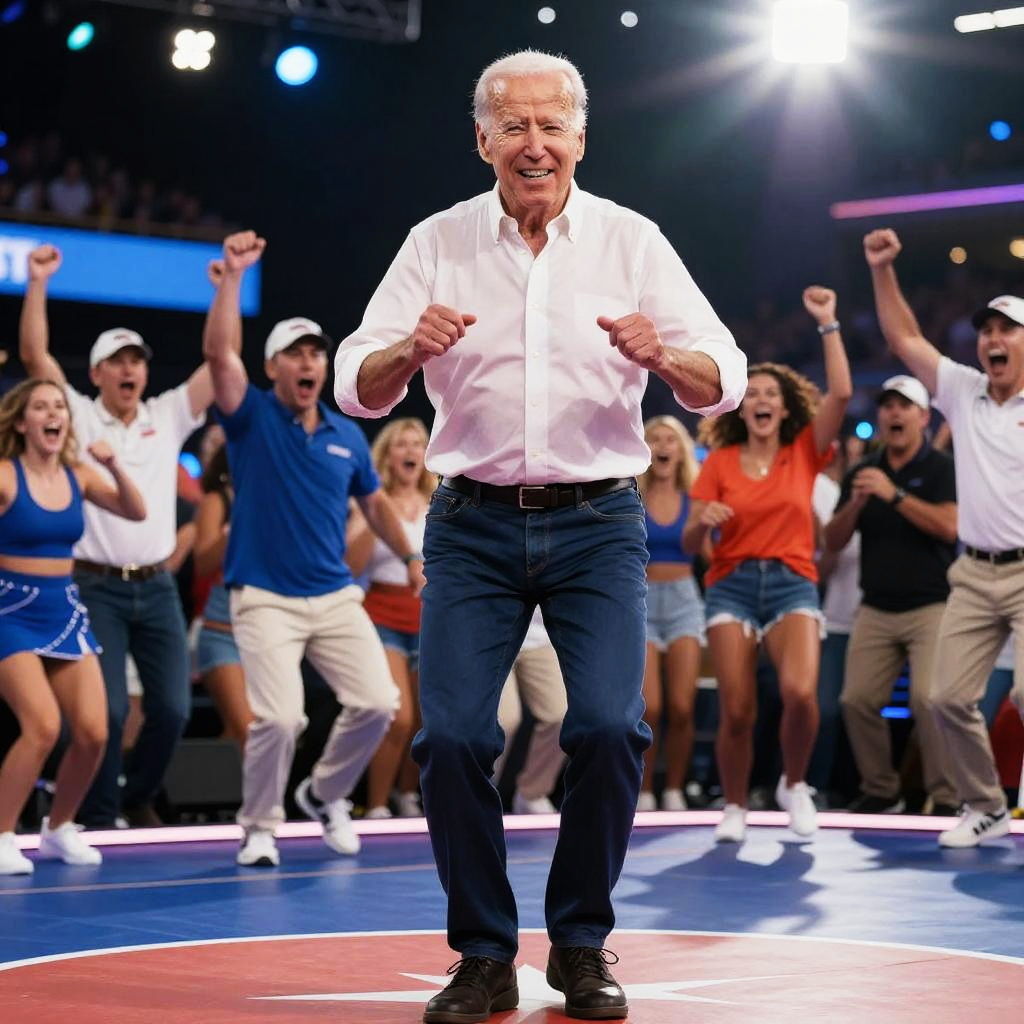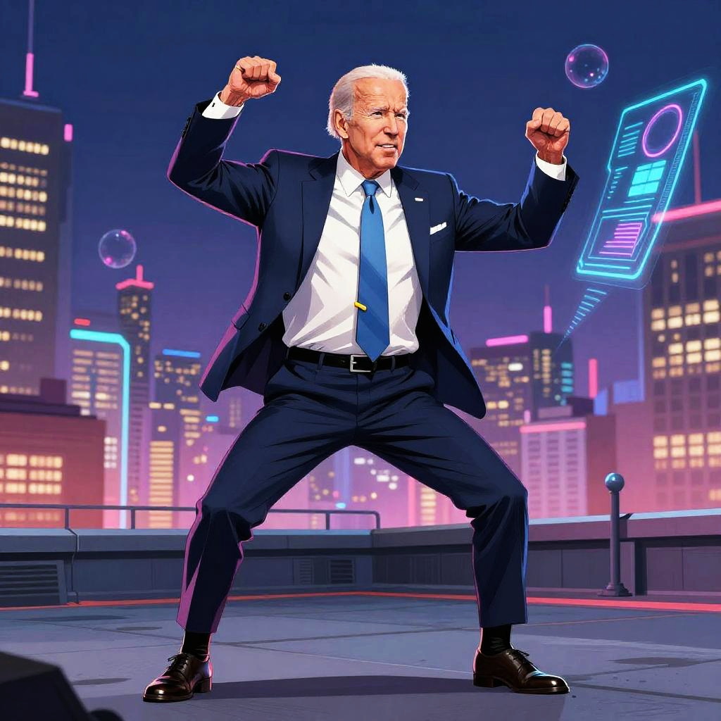 Biden eating pizza at a lively outdoor party, wearing casual clothes, with a joyful expression, warm lighting, detailed textures of pizza and surroundings, photorealistic style