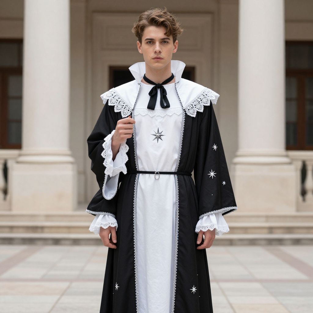 Star Crossed Romeo Boy Costume, male in a black and white robe standing in front of a building