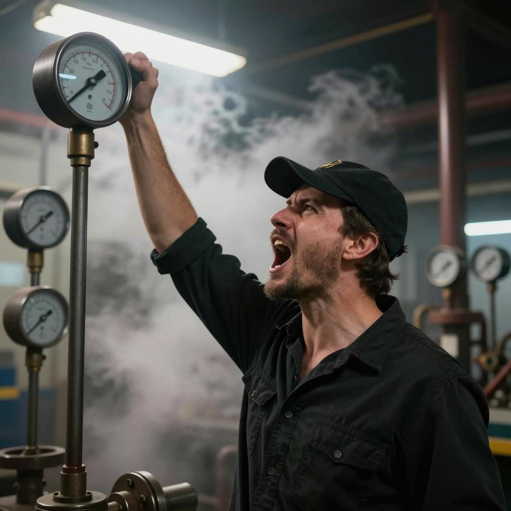 A bearded man wearing a black cap and unbuttoned black shirt shouts angrily while gripping a large round pressure gauge with his right hand in an industrial setting. The background features multiple gauges and pipes with steam and beams of light illuminating the dimly lit space, creating a tense atmosphere.