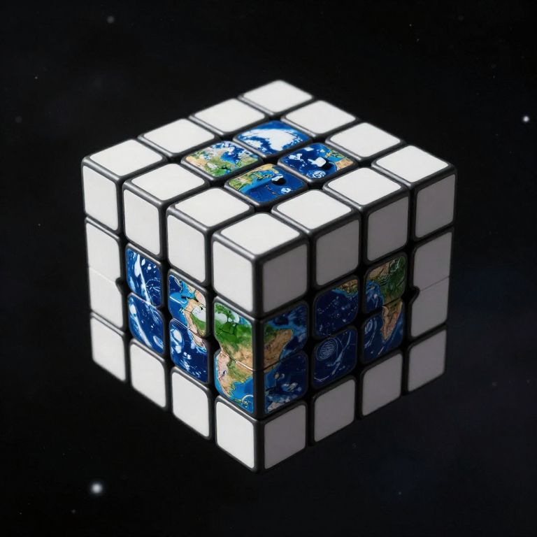 Photograph of a 3D Rubik's Cube with a twist: each face features vibrant, colorful, globe-like patterns depicting Earth's continents and oceans. The cube's faces are illuminated with bright white light, creating a glowing effect. The cube is floating against a stark black background, emphasizing its luminous, almost otherworldly appearance. The cube's edges are black, contrasting sharply with the white and colorful faces, making the globe patterns stand out vividly. The image has a digital, high-contrast aesthetic, highlighting the cube's intricate design and futuristic look.