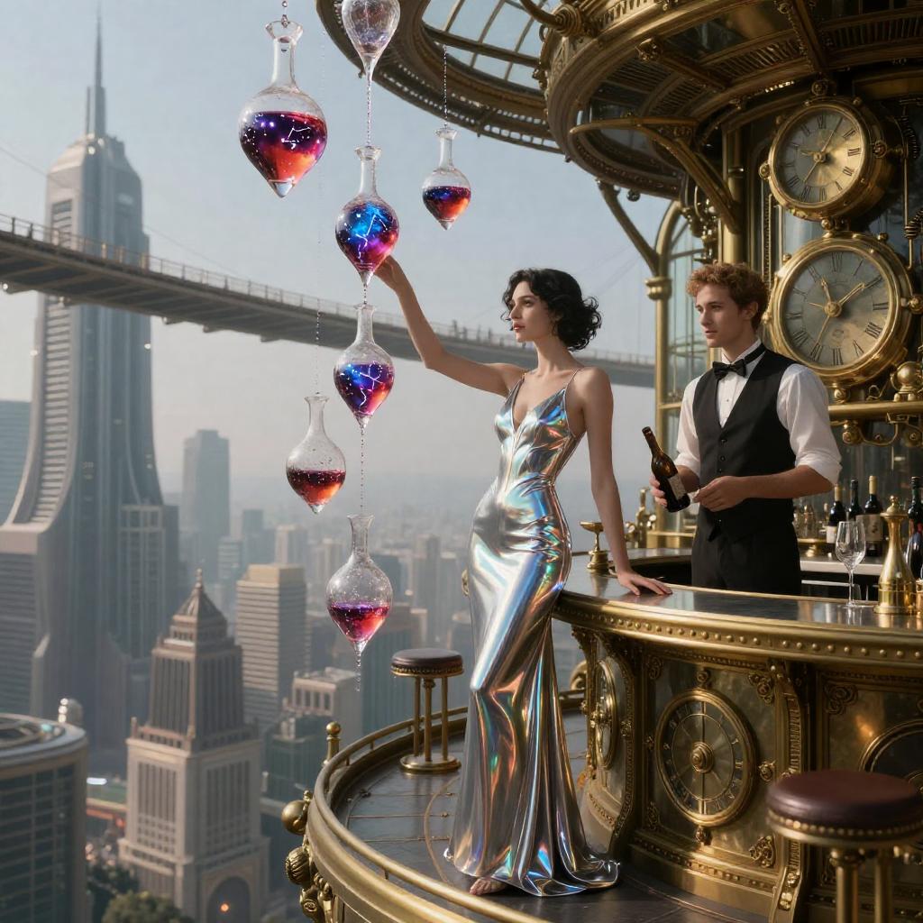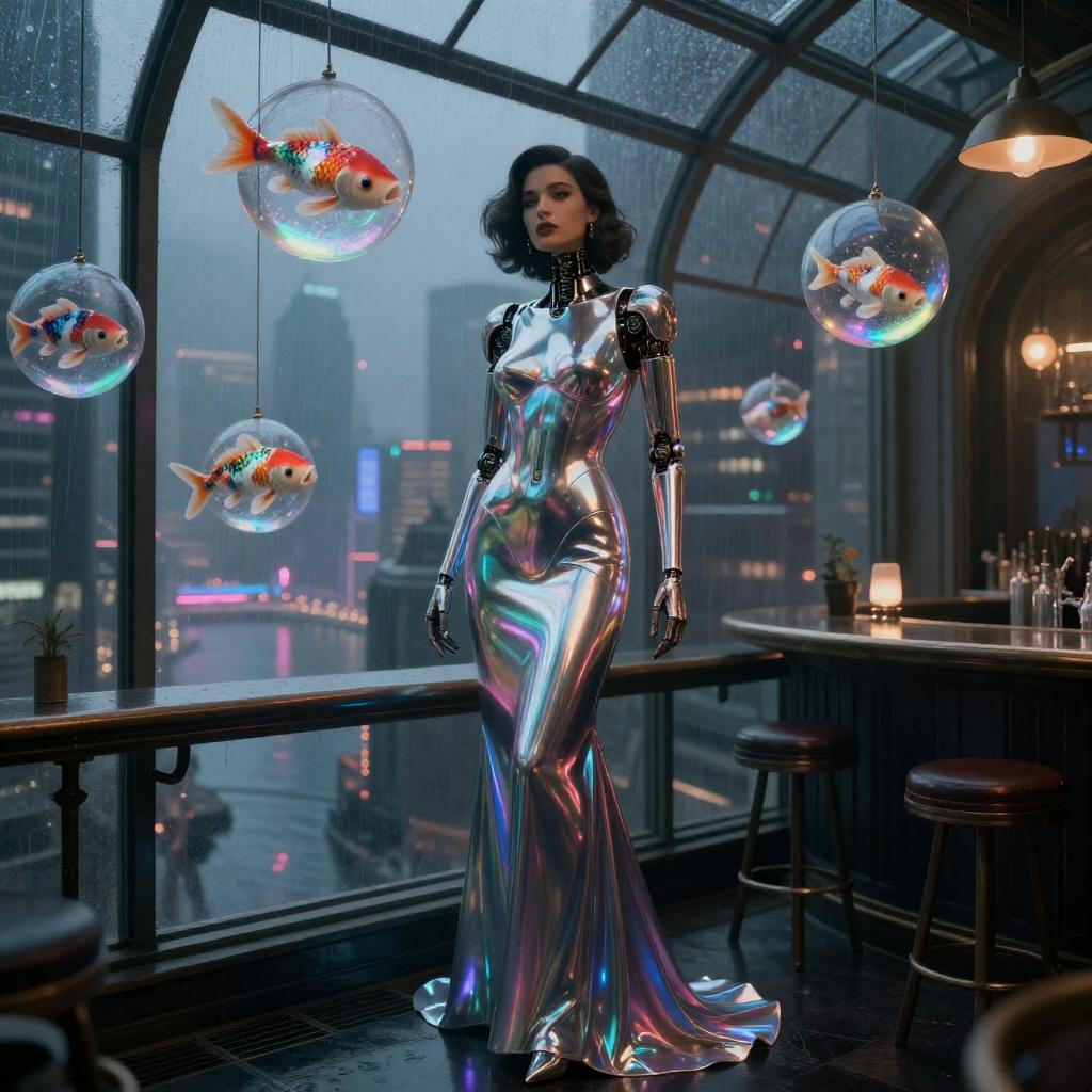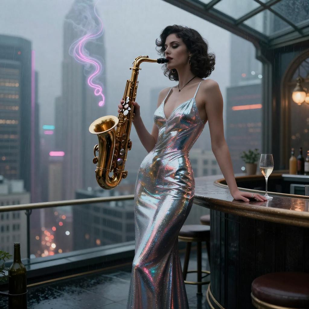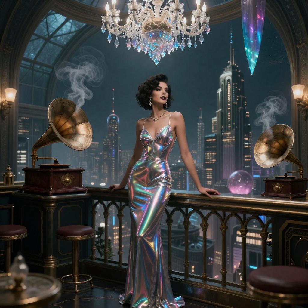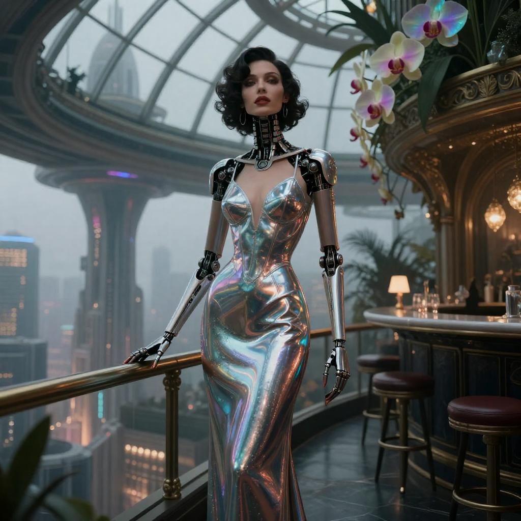 ((beautiful dark gritty Noir Noir android opera chanteuse in vivid dreamlike retro-futuristic city rooftop greenhouse speakeasy full body close up professional illustration artwork portrait character concept art 4k UHD fantasy Wallpaper in a fantasy glass greenhouse speakeasy lounge with holographic neon bonsai trees in glass planters atop the rooftop bar standing on the rooftop bar overlooking the city below)) ((wearing striking iridescent chrome hologram gown maxi dress)) ((by Syd Mead and Alayna Lemmer and Alphonse Mucha)), Rembrandt lighting, natural beauty, concept city, utopia, space age technology, epic long view distance, towering buildings.