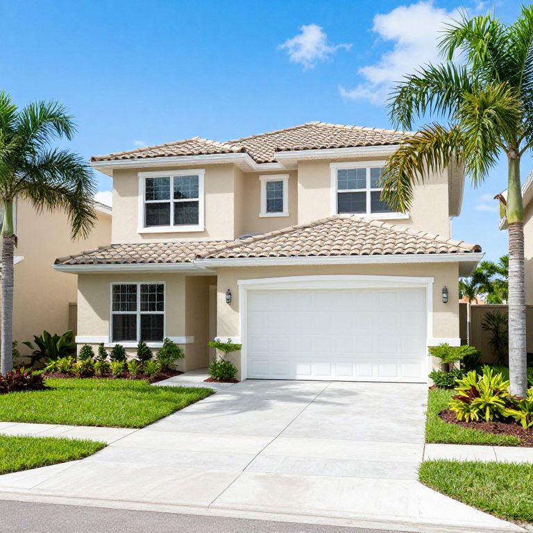 Sunny two-story home featuring a light beige exterior, white garage door, and tiled roof, surrounded by lush green landscaping and palm trees, situated in Snell Isle Brightwaters, St Petersburg.