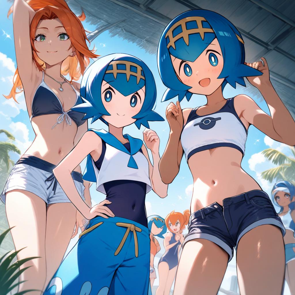 Swf, SFW, lillie_pokemon, multiple girls, 6girls, hat, blonde hair, heart, brown hair, skirt, long hair, beanie, tam o shanter, black hair, green hair, socks, twintails