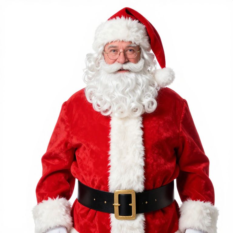 Male santa claus with a red and white outfit and a Christmas wreath around his neck