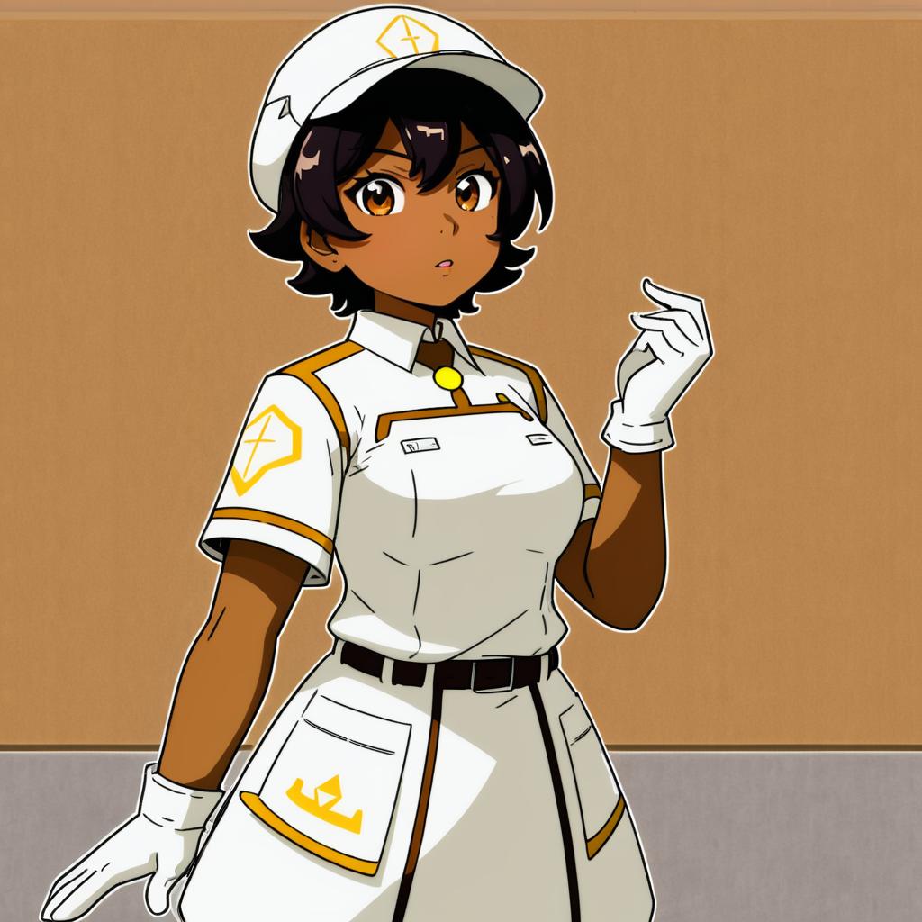 Aether foundation employee, pokemon, 1girl, dark-skinned female, brown eyes, short hair, black hair, brown hair, large breasts, aether foundation uniform, white headwear, white gloves, hat, short sleeves, by artist nokuhashi, anime