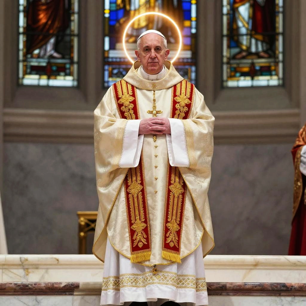 Pope Francis outfit shown in ceremonial papal attire with intricate gold and red accents, softly glowing halo effect, detailed depiction of liturgical vestments, standing on marble steps with stained glass windows behind, hyper-realistic and majestic composition.