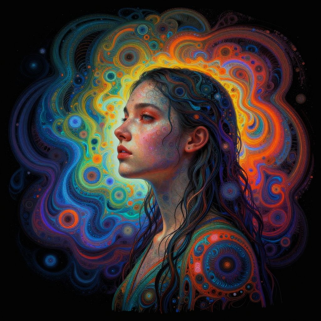 Digital artwork of a human head in profile, showcasing a colorful, intricate, bioluminescent neural network with vibrant reds, blues, and yell