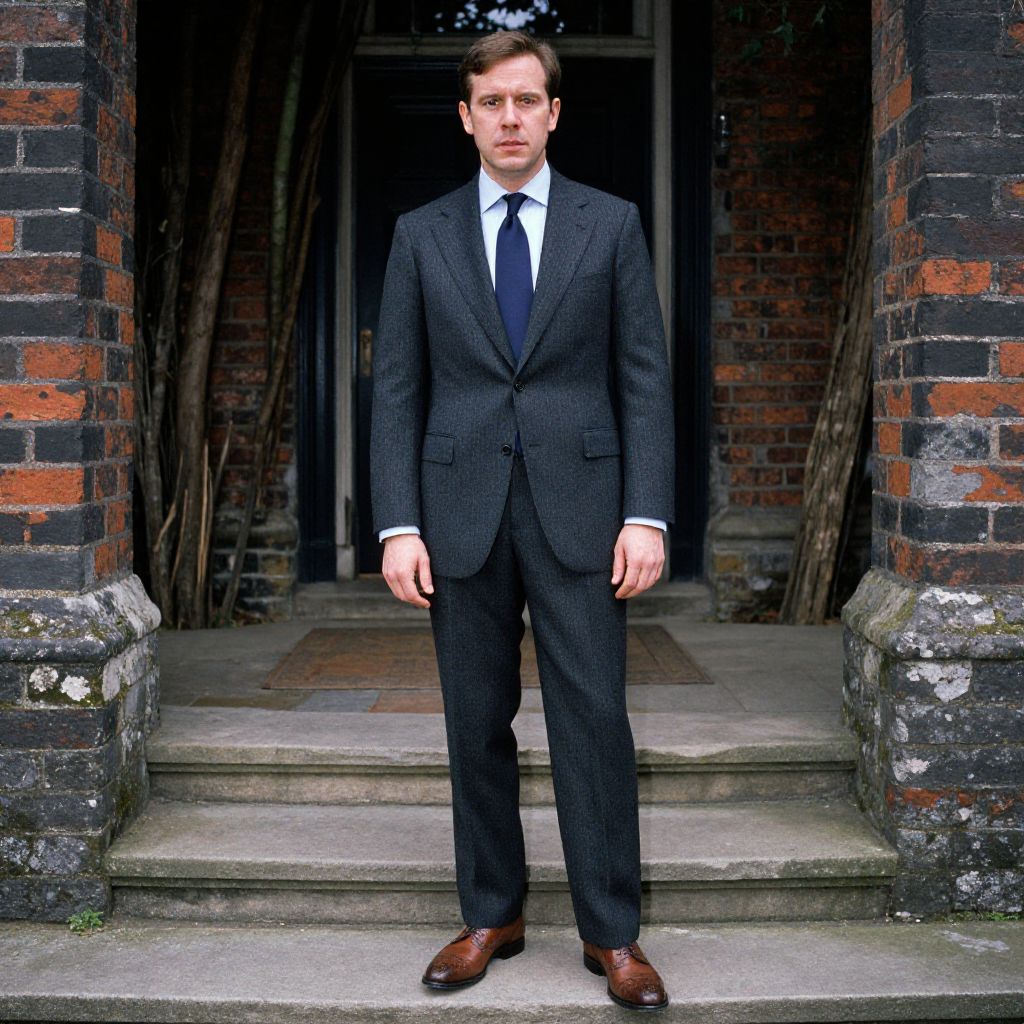 Photograph of a Caucasian man with short brown hair, standing in front of a brick building's dark doorway. He is dressed in a dark pinstripe suit with a white shirt and navy tie, and brown leather shoes. His expression is serious and he stands with hands at his sides. The brick walls are black and red, with moss on the steps. The background includes a dimly lit interior with visible wooden beams. The image has a watermark in the bottom left corner. The overall style is formal and professional.