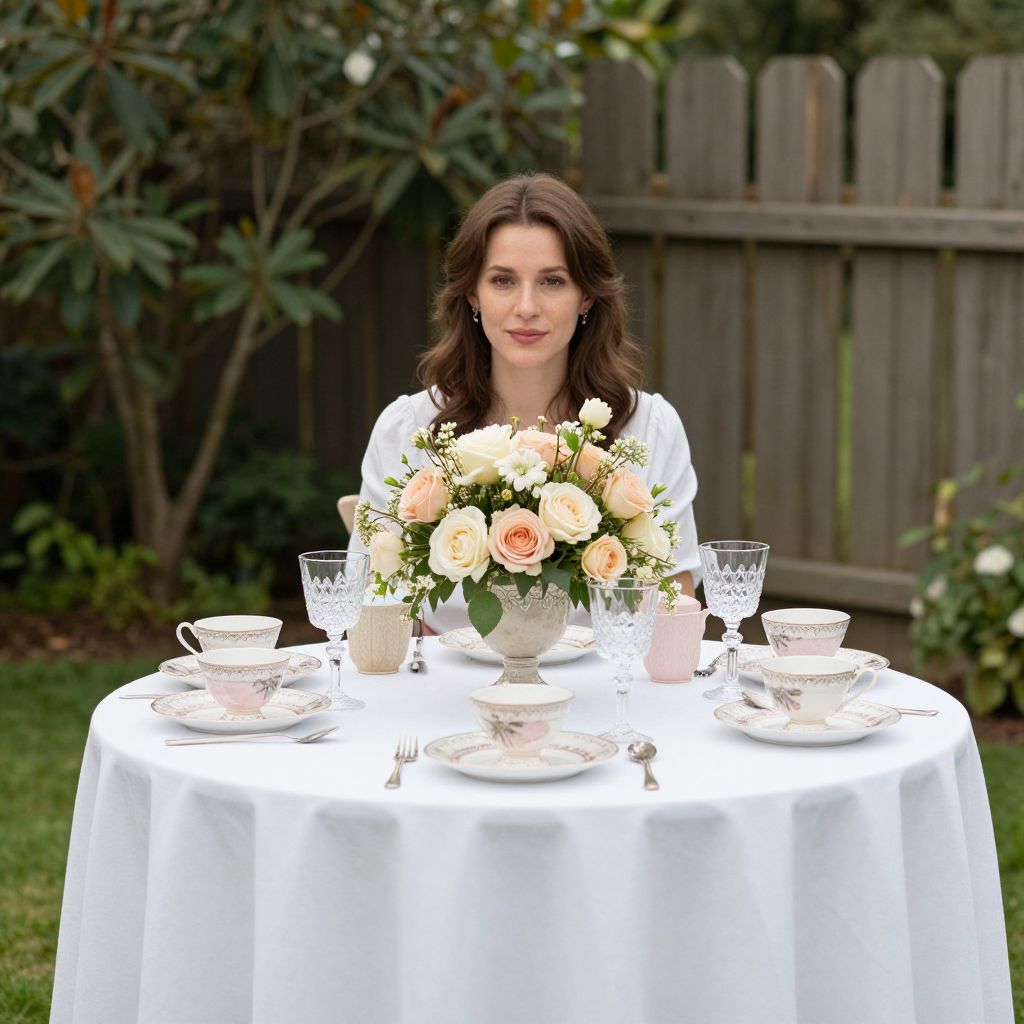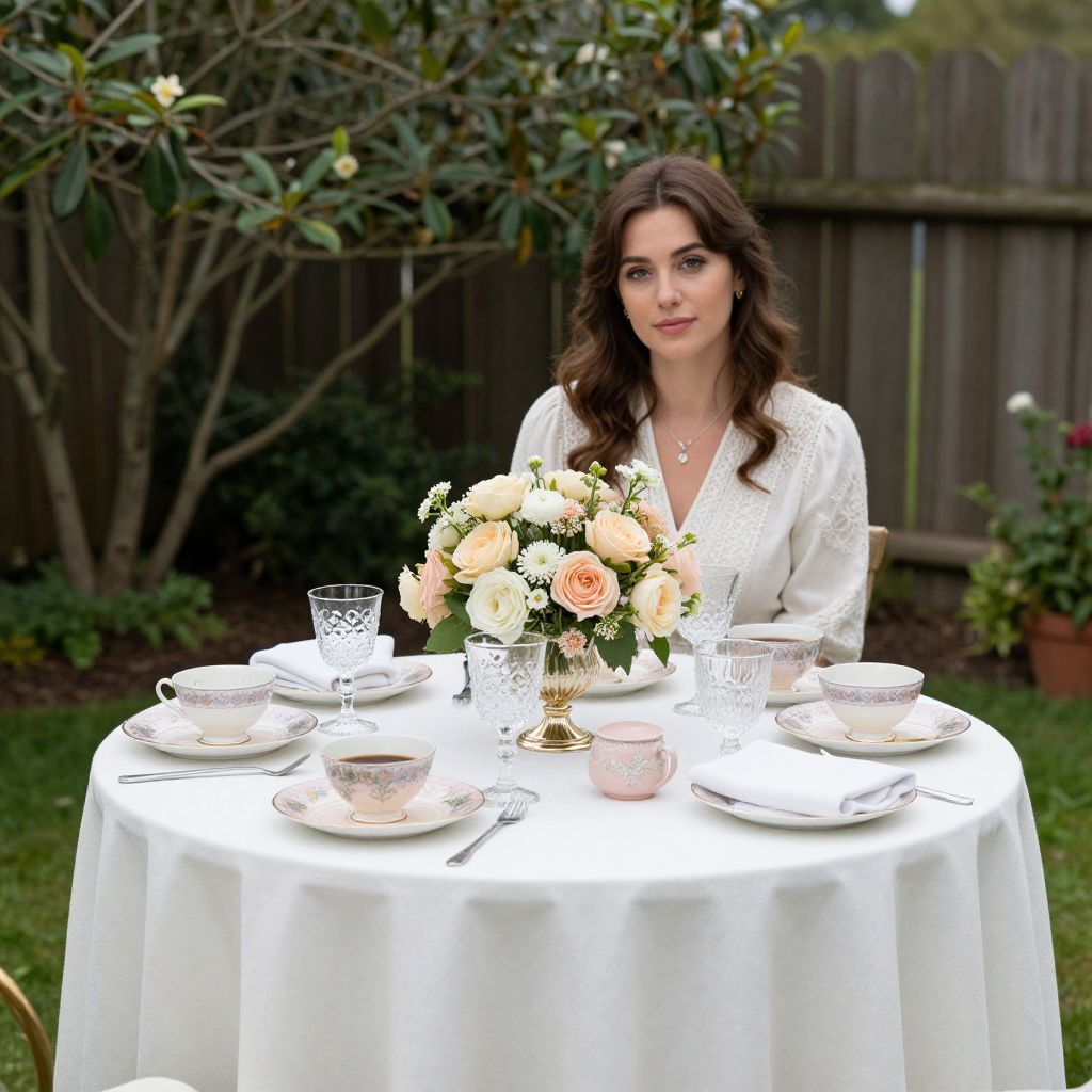 Romantic garden tea party unfolds with a woman seated gracefully at a round table draped in a crisp white tablecloth, featuring a delicate floral arrangement of blush and cream blooms as its centerpiece, surrounded by vintage-inspired teacups, glassware, and pastel accents against a backdrop of lush greenery and a rustic wooden fence.