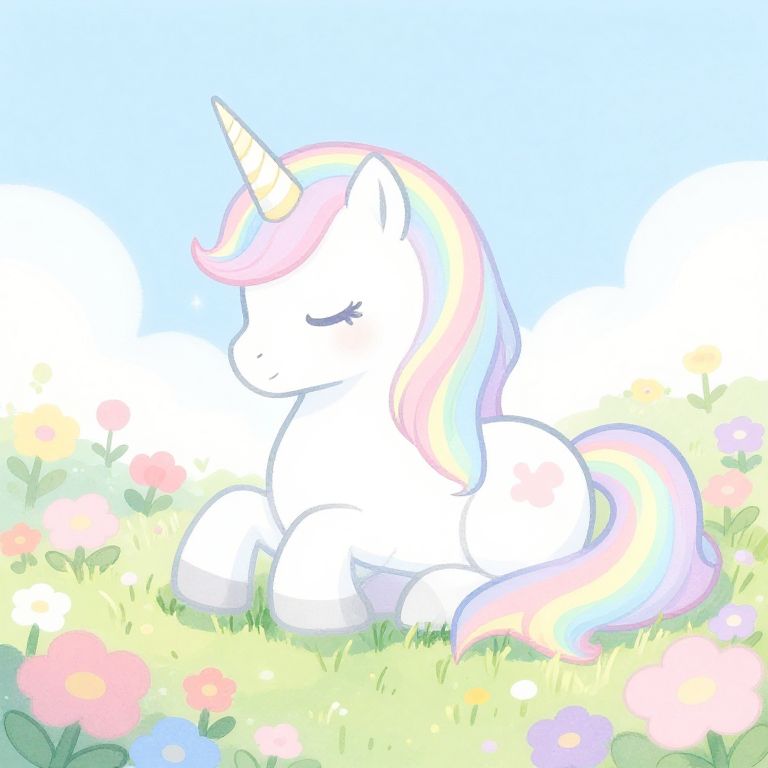 Whimsical digital drawing of a white unicorn with a pastel rainbow mane and tail, peacefully resting in a bright, flower-filled meadow under a