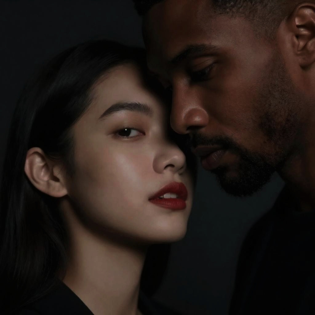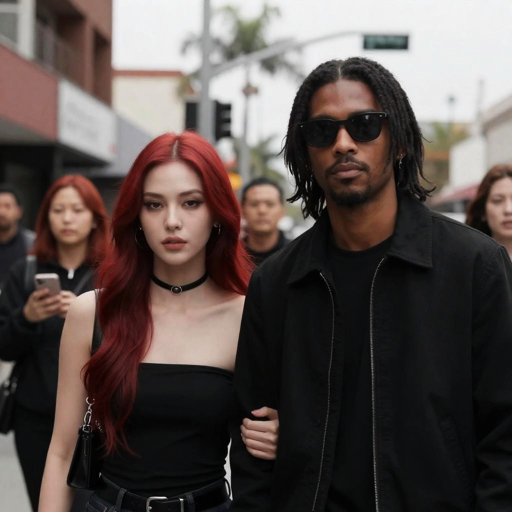 Photograph of a street scene with a man and a woman in the foreground. Man has long dark hair, sunglasses, black jacket, and dark skin. Woman has red hair, black choker, strapless top, pale skin. Background has several people, one with red hair, some looking at camera. Urban setting with buildings, traffic lights, and palm trees. Man's hand on woman's arm. Woman's expression is neutral.
