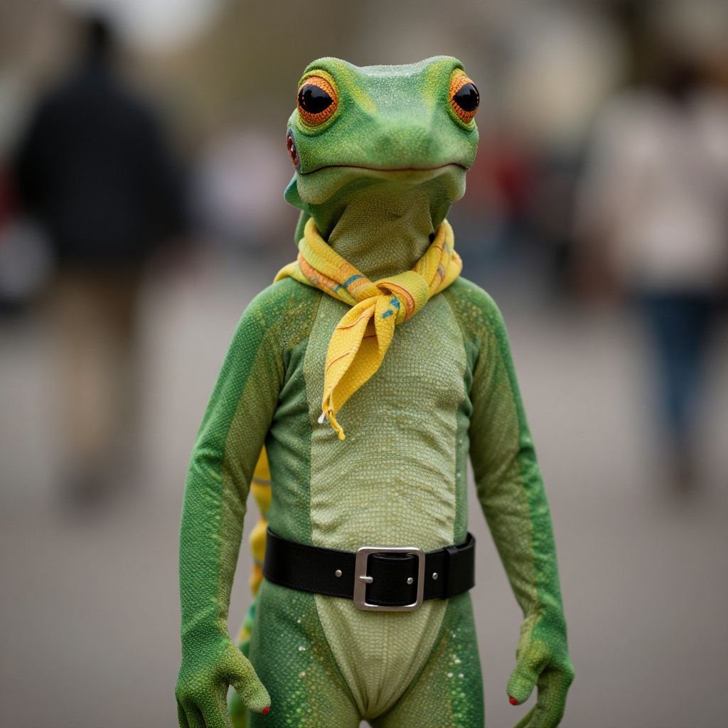 Photograph of a green frog costume with yellow scarf, black belt, and large orange eyes, standing in a blurred outdoor street.