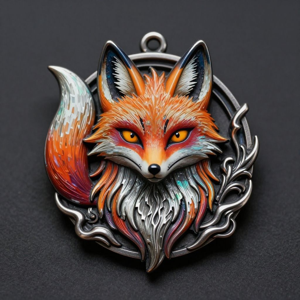 Metal trinket depicting a Kitsune - Fox spirit from Japanese folklore, often depicted as a trickster. Regina Valluzzi, natural, shimmering, vibrant, gothic, rpg, 1400ad, ultra detailed, detailed, immersive, reminiscent of high fantasy RPG games, HD, masterpiece, best quality, hyper detailed, super realistic, perfect face, perfect hands, award-winning, professional, breathtaking, linquiveraunbroken Atolltolerable weatherpixel-art . low-res, blocky, pixel art style