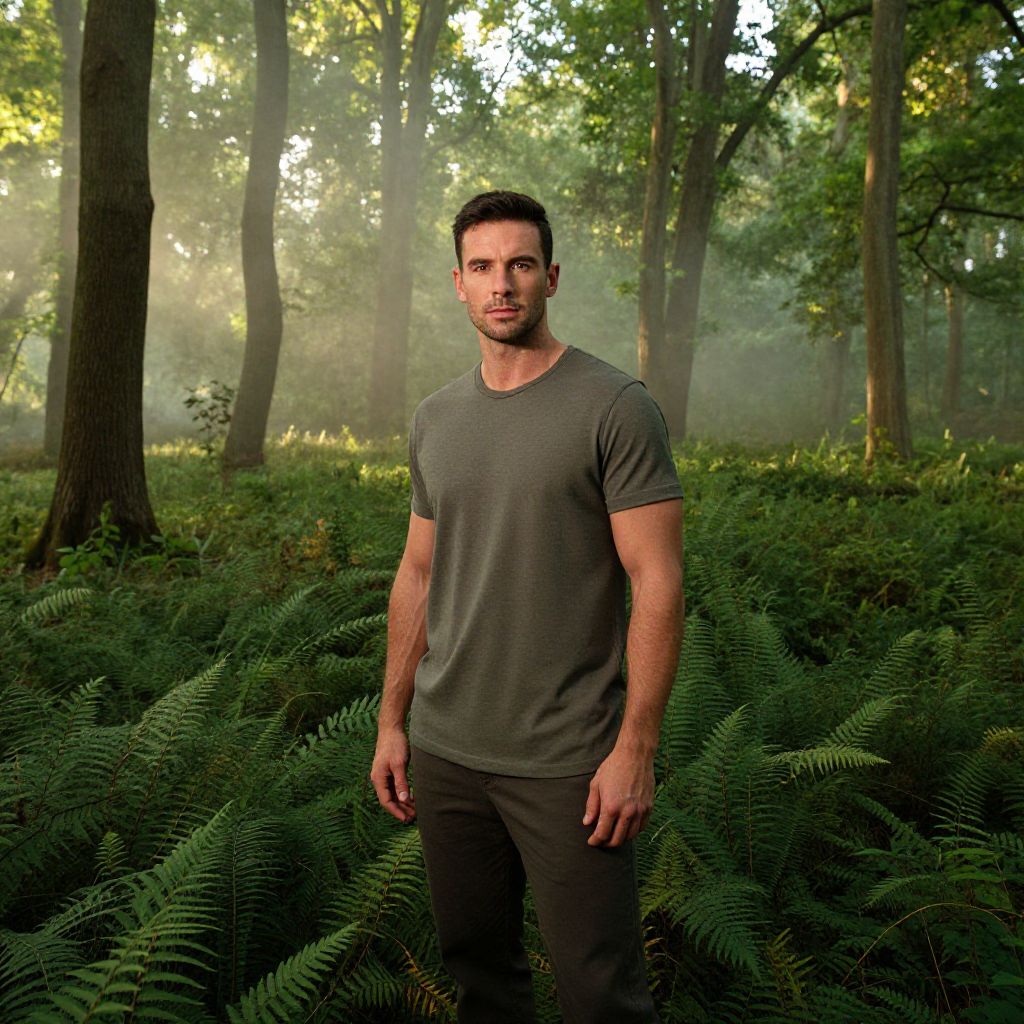 Photograph of a muscular, bearded man in a grey t-shirt and black pants standing in a sunlit, misty forest with lush ferns