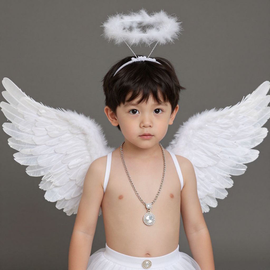Photograph of an Asian toddler with short black hair, wearing a white halo headband with fluffy white feathers, and large white feathered angel wings. The child is dressed in a white, strapless tutu and a silver necklace with a circular pendant. The toddler's skin is light, and they have a neutral expression. The background is a solid, dark gray. The child is standing center-frame, looking directly at the camera. The overall style is playful and angelic.