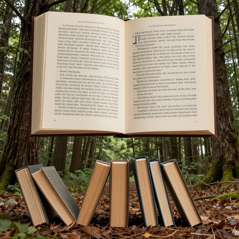 Photograph of an open book floating above seven leaning books in a dense forest, sunlight filtering through trees, brown forest floor with scattered leaves.
