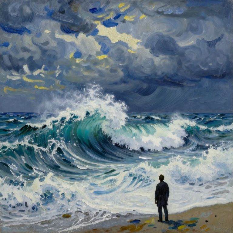 Envision a powerful seascape painting, reminiscent of van Gogh's turbulent style, showcasing an ocean in turmoil with crashing waves under a striking stormy sky. The viewpoint shifts to reveal the swirling vortex within each wave as they crash onto the shore, capturing the dynamic energy and raw power of nature. Bold brushstrokes emulate the intensity of the raging sea and the swirling clouds above, evoking an emotional gradient that oscillates between awe-inspiring beauty and underlying tension. A solitary figure stands resolutely in the foreground against this immense landscape, their silhouette prominent against the tumultuous sky, symbolizing endurance amidst nature's fury.