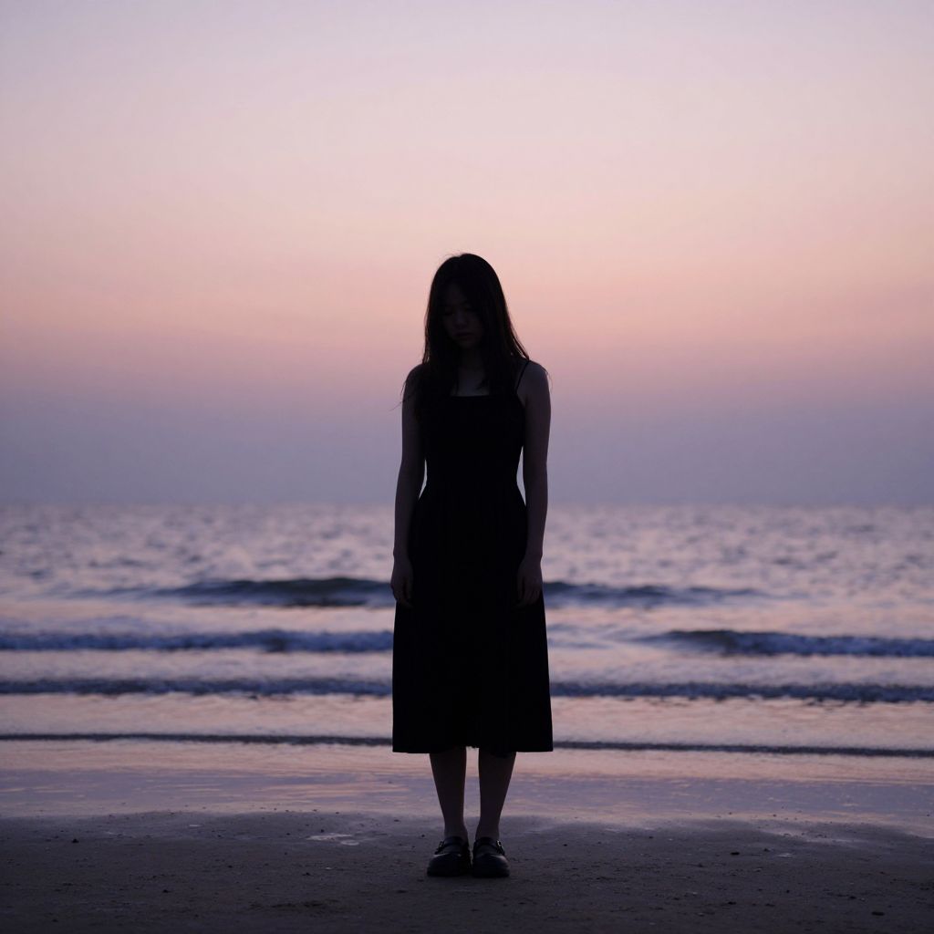 Sad woman silhouette standing alone on a deserted beach at sunset, soft pastel sky blending with gentle waves, a melancholic atmosphere, minimalistic style with subtle shadows and light reflections, emphasizing solitude and emotion.