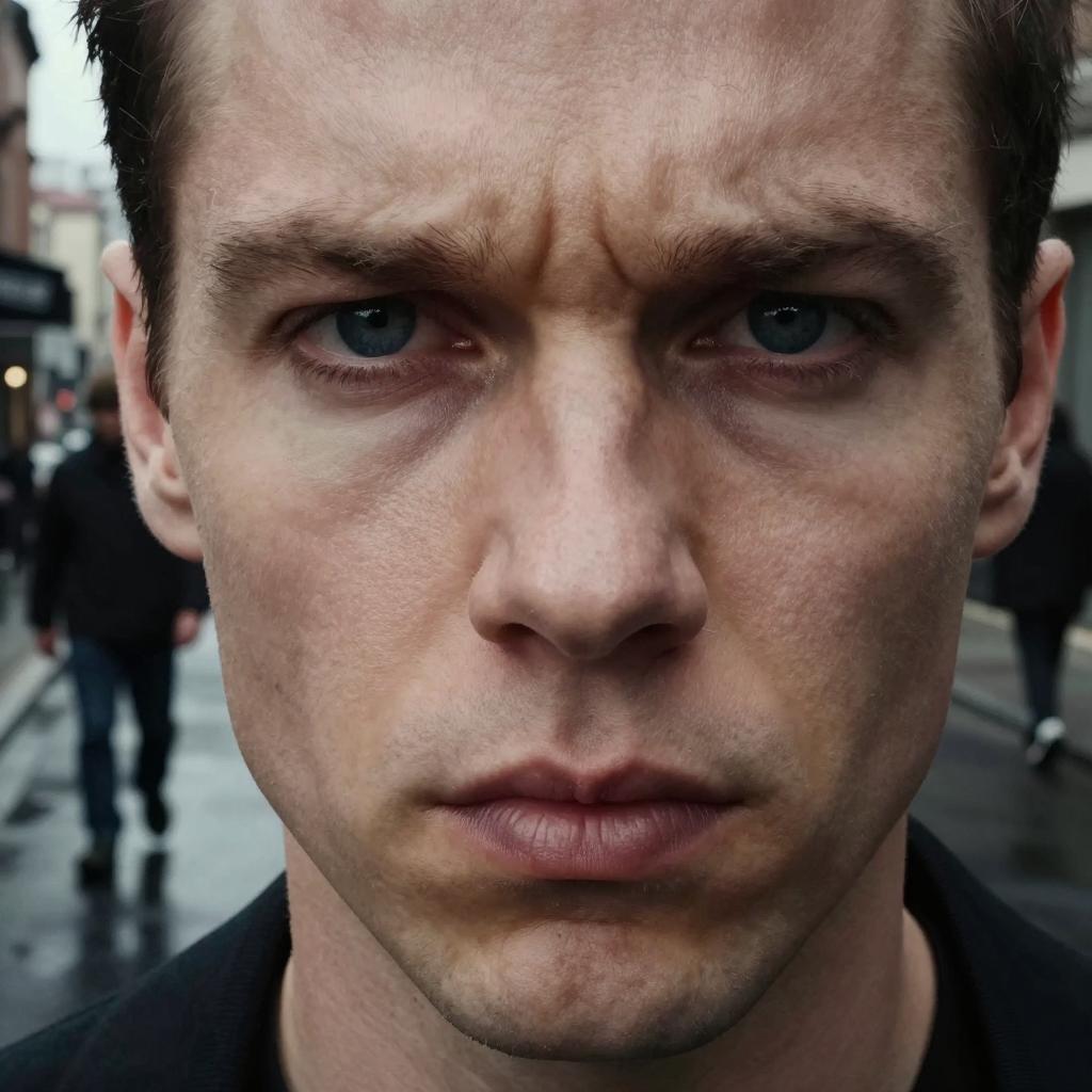 Close-up photograph of a serious man with intense blue eyes, slightly furrowed brow, and pursed lips. Background: dimly lit urban street, silhouetted man in the distance, wearing dark clothing, standing on wet pavement with reflections. Two silhouettes in the background. Textured, grainy visual style.