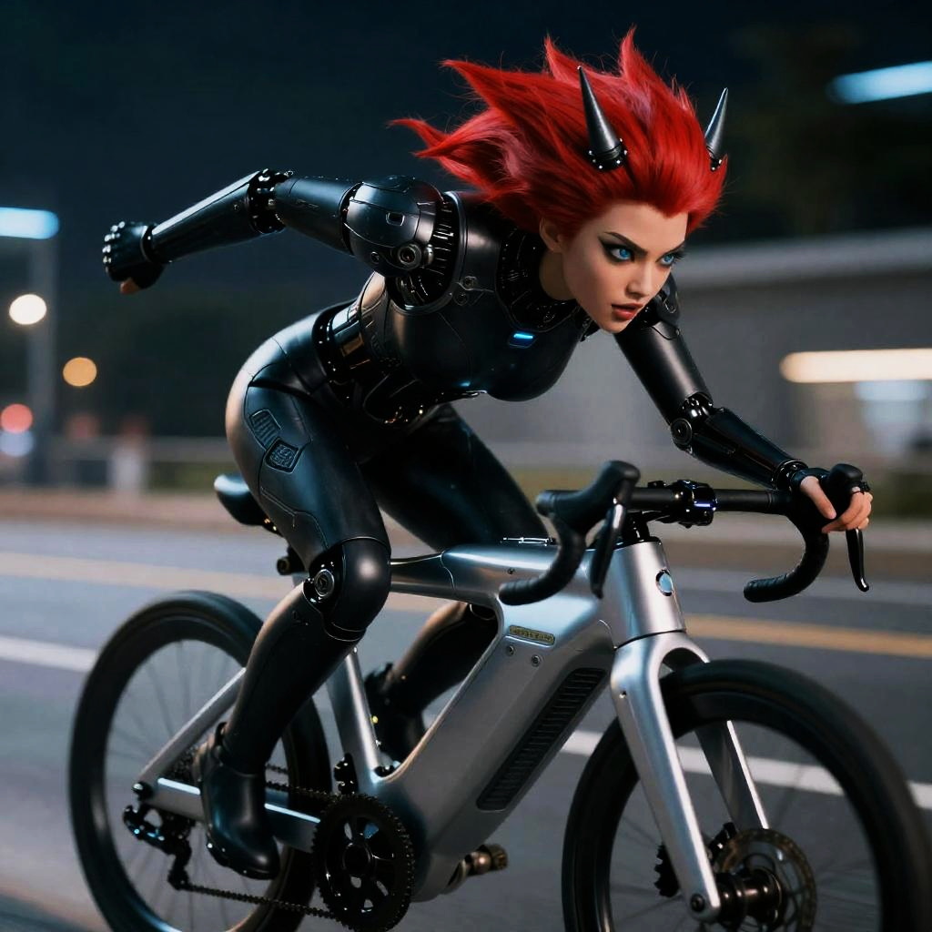 Cinematic photo of cyberpunk Bowser on a silver sci-fi armored cybernetic bicycle at night, dynamic pose, detailed eyes, green-shelled, red hair, spikes, tiny horns, bushy eyebrows, open mouth, hi-tech, deep shadows, vibrant, crisp, sleek, ultramodern, cinematic, ultra detailed, professional, film, bokeh, 4k, highly detailed