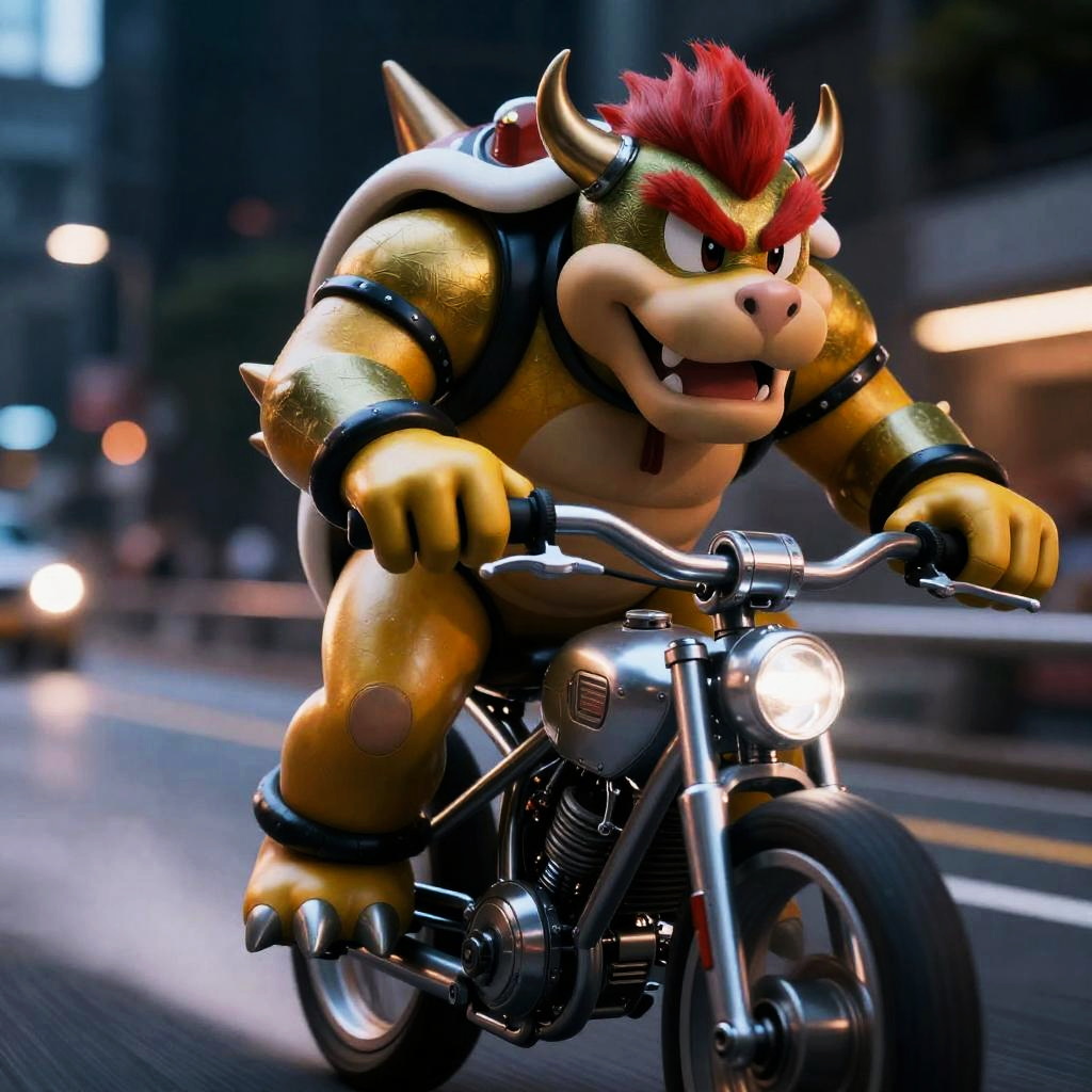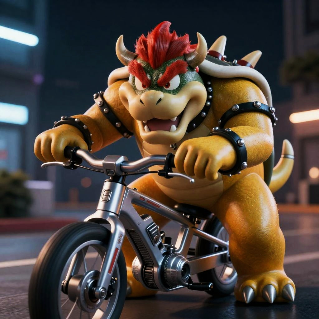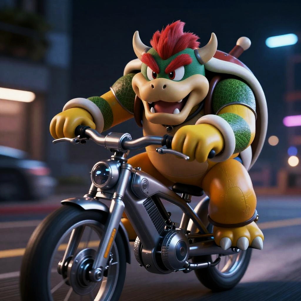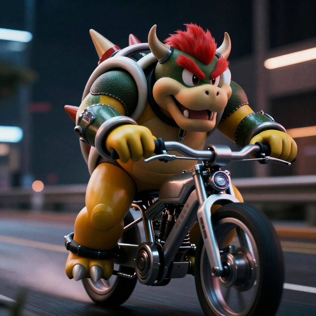 A cinematic image of Bowser, a green-shelled character with red hair, bushy eyebrows, and spikes, riding a silver sci-fi armored cybernetic motorcycle at night. The scene features detailed eyes, tiny horns, open mouth expression, and dynamic pose with deep shadows and vibrant lighting, captured in ultra-detailed 4K quality with a futuristic cyberpunk theme.