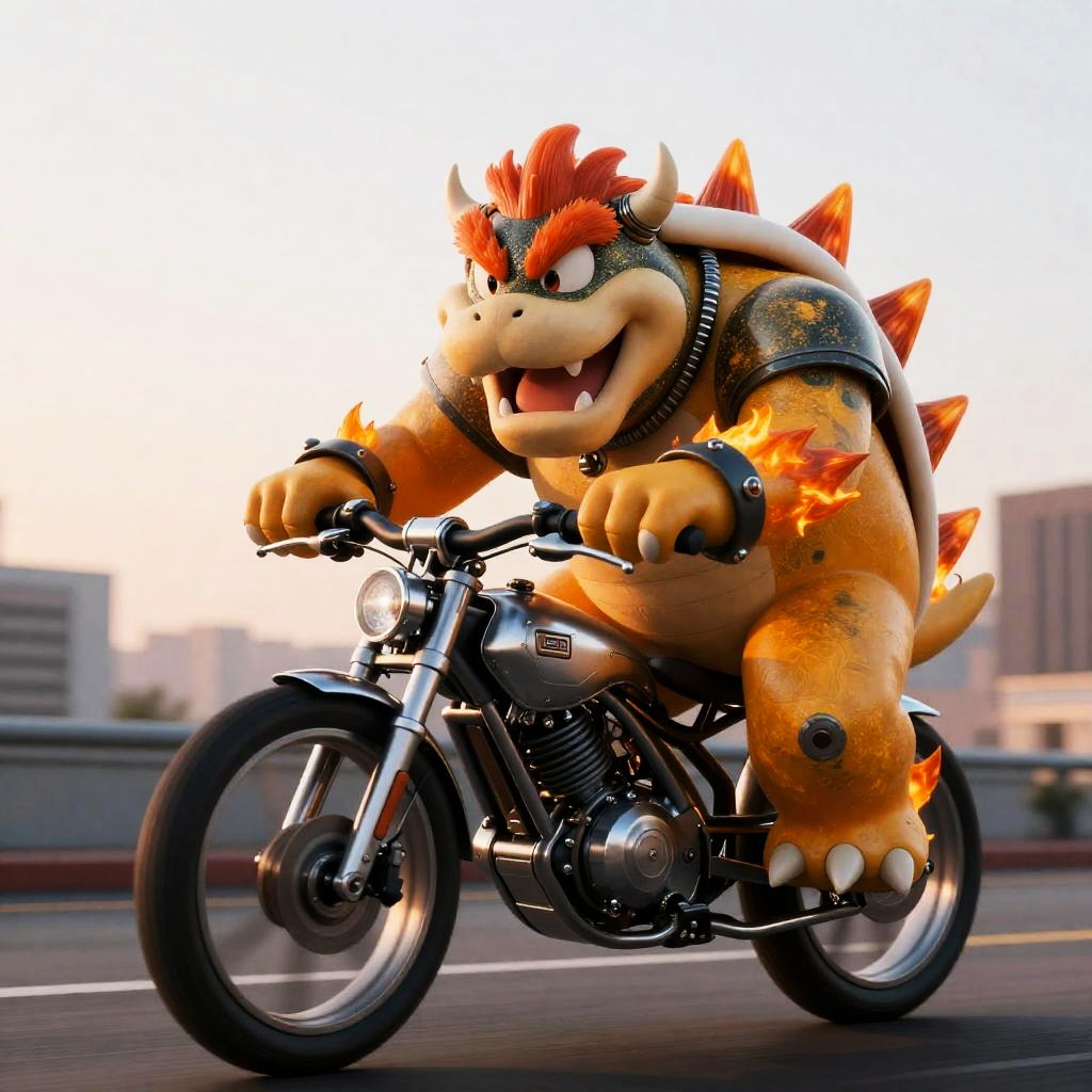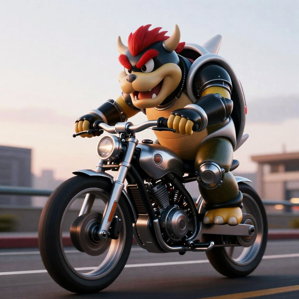 Cyberpunk Bowser Riding Silver Sci-Fi Motorcycle