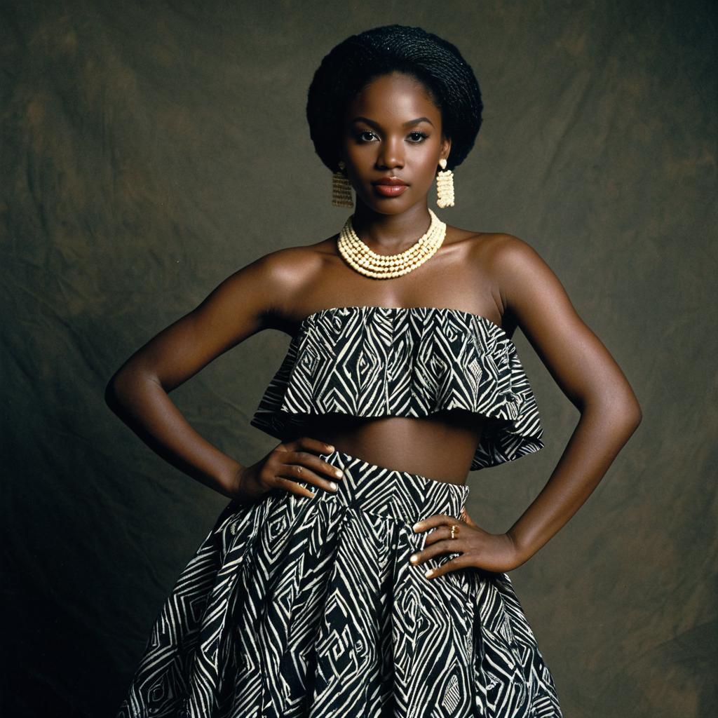 African wear costume ,1girl, solo, jewelry, earrings, necklace, black hair, hand on own hip, long skirt, bare shoulders, dress