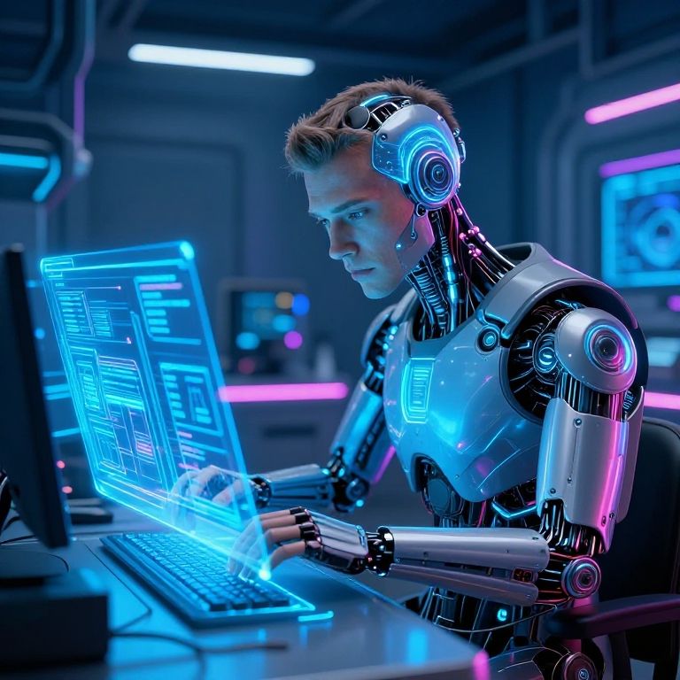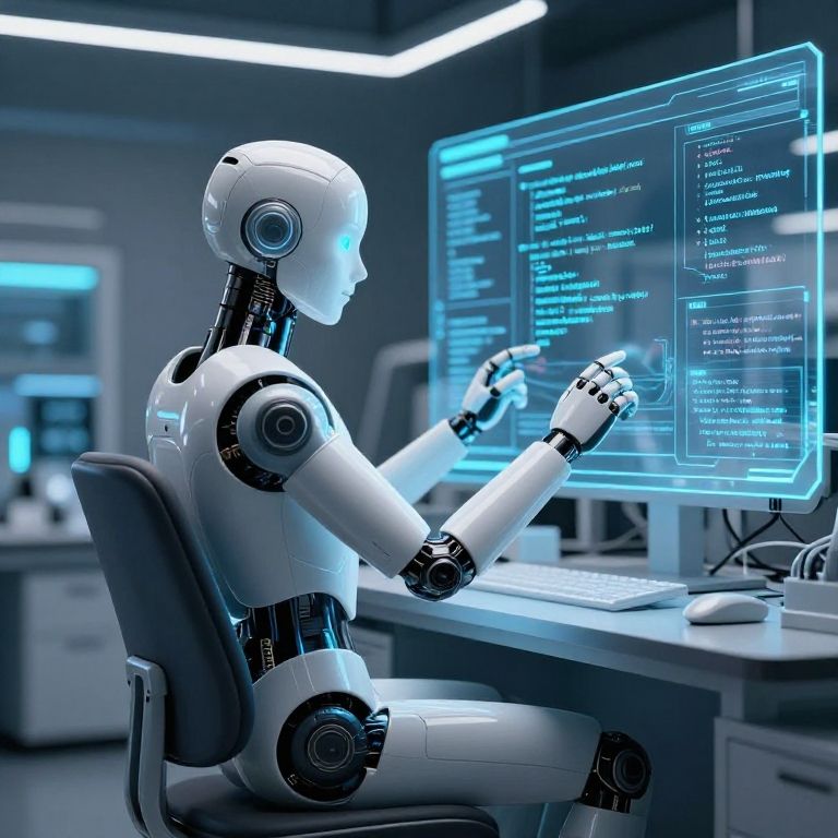 A digital illustration depicting a white humanoid robot with black joint details, seated in a modern, dimly lit office. The robot, with a sleek, futuristic design, is focused on a large computer monitor displaying blue-coded, technical code on the screen. The robot's right hand is poised above the keyboard while its left hand points to the monitor. The desk is minimalist, with a keyboard and a mouse. The background features blurred office equipment and furniture, emphasizing the high-tech, professional setting. The overall color palette is dominated by cool blues and whites, enhancing the technological and sleek atmosphere.