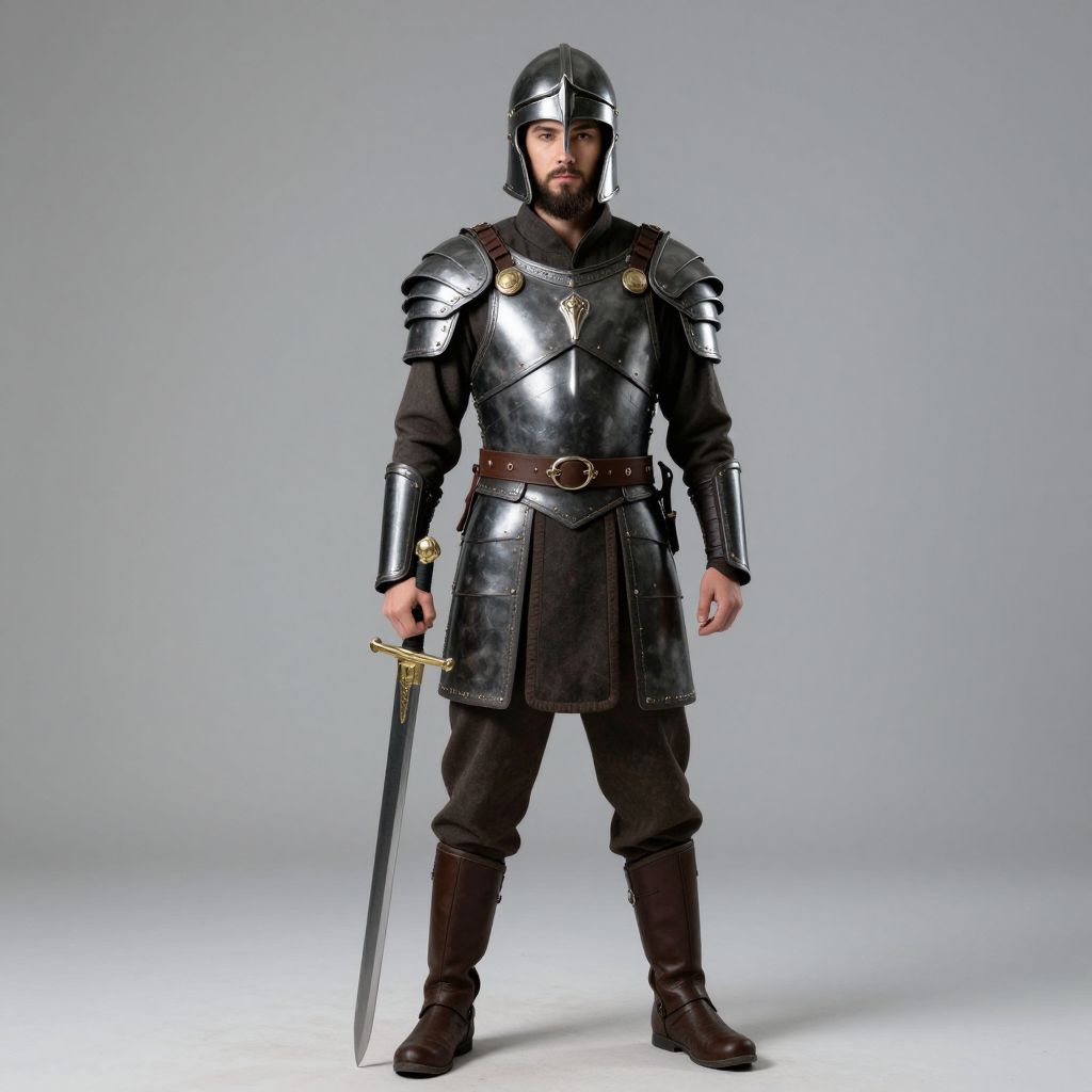 Photograph of a bearded man standing against a plain gray background. He is dressed in medieval-style black armor, including a shiny steel helmet, chest plate, shoulder guards, and a leather skirt with a brown leather belt. He holds a long, straight sword with a gold hilt in his right hand. His black pants and brown leather boots complete the outfit. The armor is detailed with small gold accents. The man's expression is neutral, and he stands with his feet shoulder-width apart, centered in the frame. The lighting is even, highlighting the metallic texture of the armor.