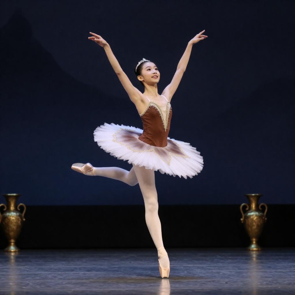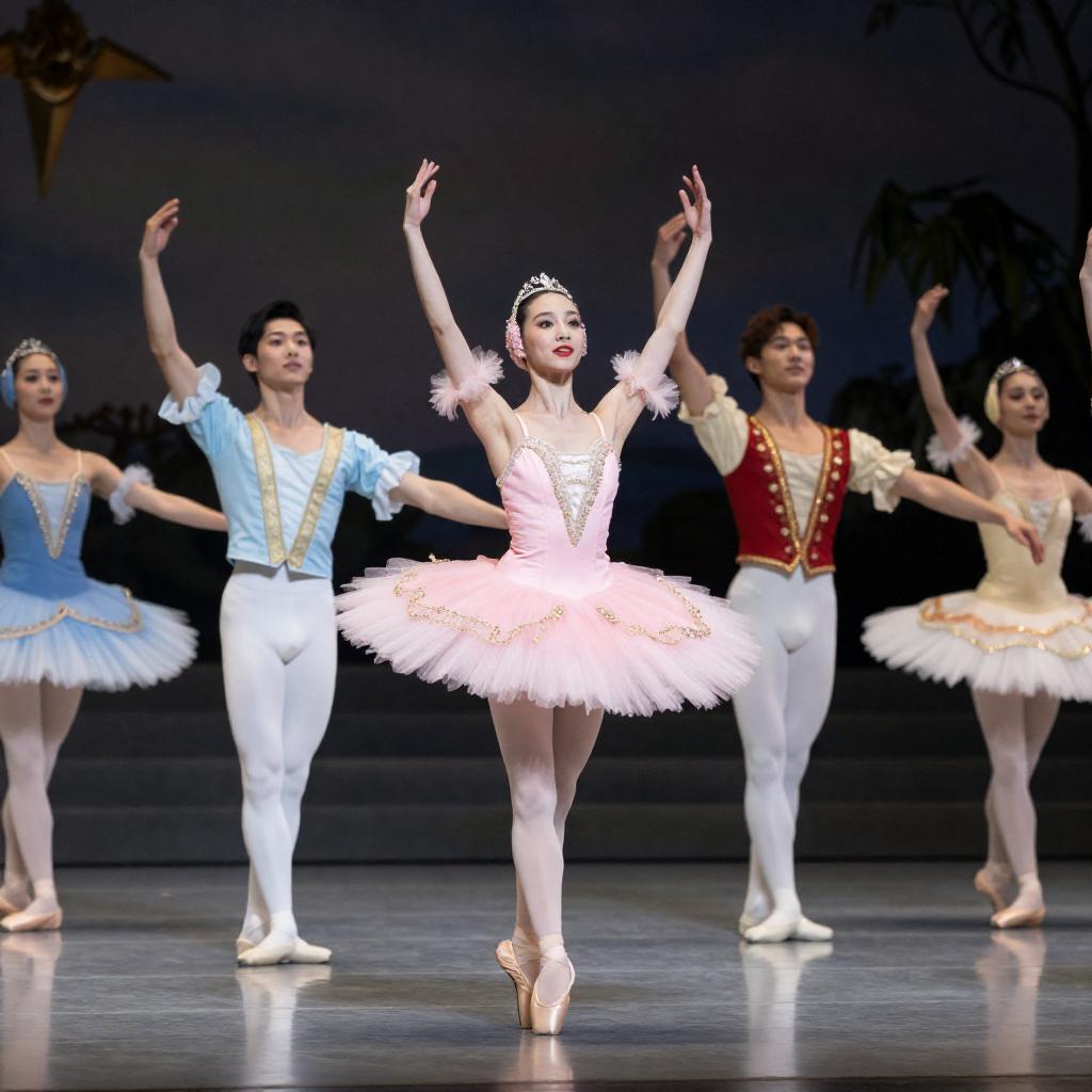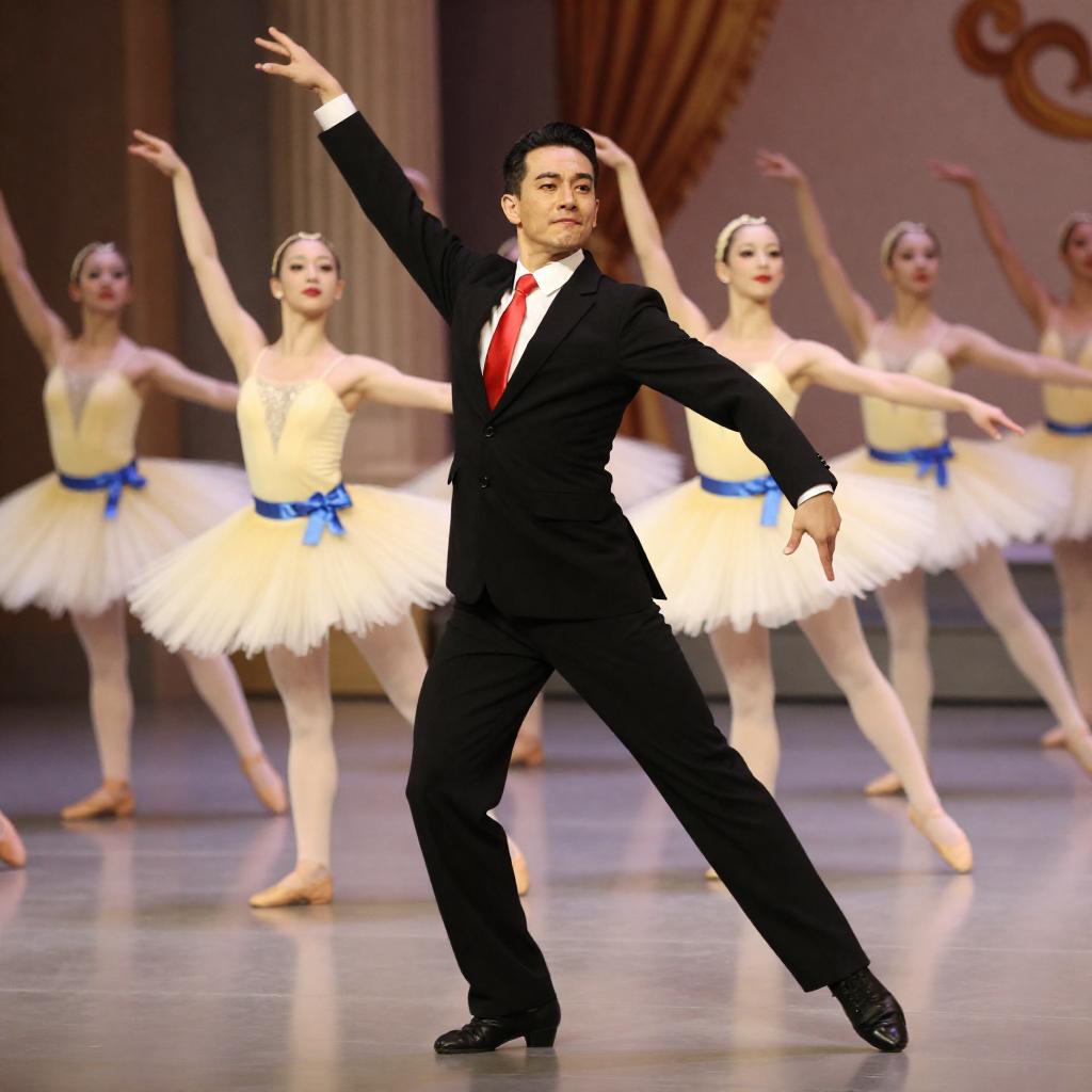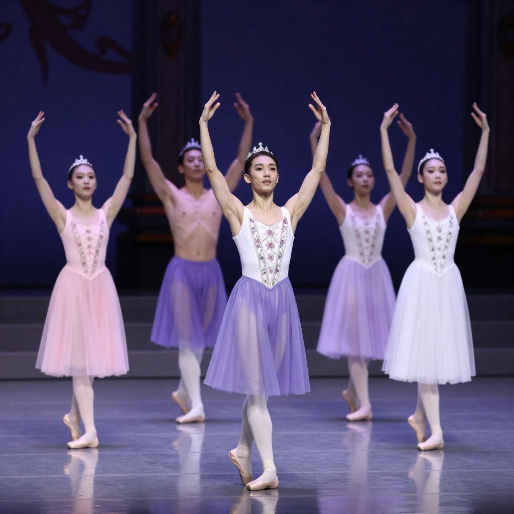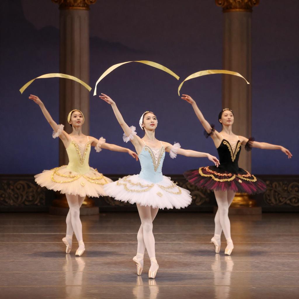 Male ballet dancer in ornate golden jacket, white tights, arms outstretched, smiling, center stage. Background: ornate dark setting, three female dancers in colorful dresses, sitting, blurred. Stage lights reflecting on floor. Dancer in focus, others slightly blurred.