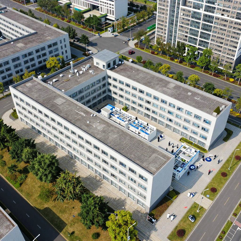 Lunenfeld medical research campus aerial view, surrounded by green spaces and modern buildings, clean, bright colors, emphasizing collaboration and breakthrough medical technology, scientists walking between labs, urban and natural harmony
