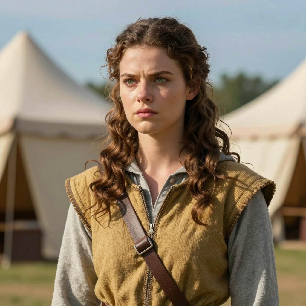 Daenerys fancy dress, photorealistic portrait of young blonde girl with wavy hair, wearing medieval-style grayish-brown dress with puffed sleeves and buttoned front, soft natural light, serious expression, blue eyes, slightly blurred stone carvings in background, daylight, realistic ures, detailed, realistic hair and clothing, slight smile, centered subject, shallow depth of field, traditional medieval clothing, child, innocent, detailed facial features, realistic lighting, outdoors