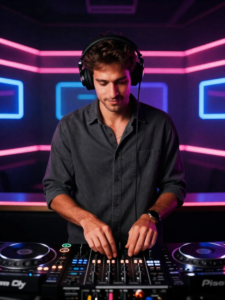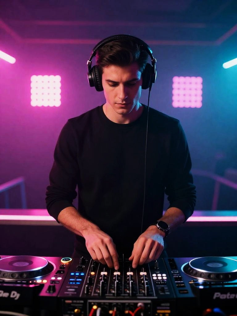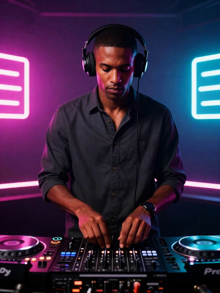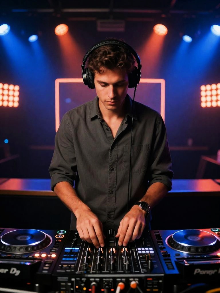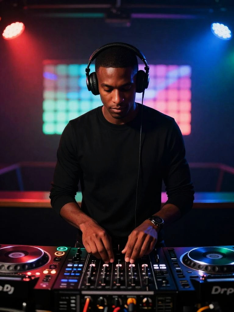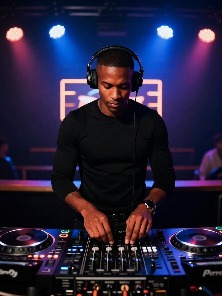 Male DJ in a club, dark-skinned man with close-cropped hair and strong jawline wearing sleek fitted black long-sleeve shirt, standing behind a long DJ booth with three decks, both hands on the mixer as he looks down at the controls, headphones over his ears, vibrant electric blue spotlights with warm orange accents and glowing LED panels in the background, cinematic nightlife scene, realistic, ultra-detailed