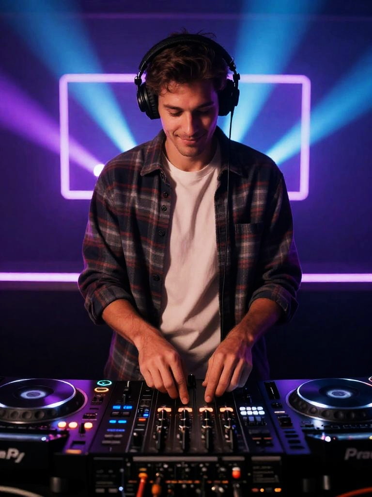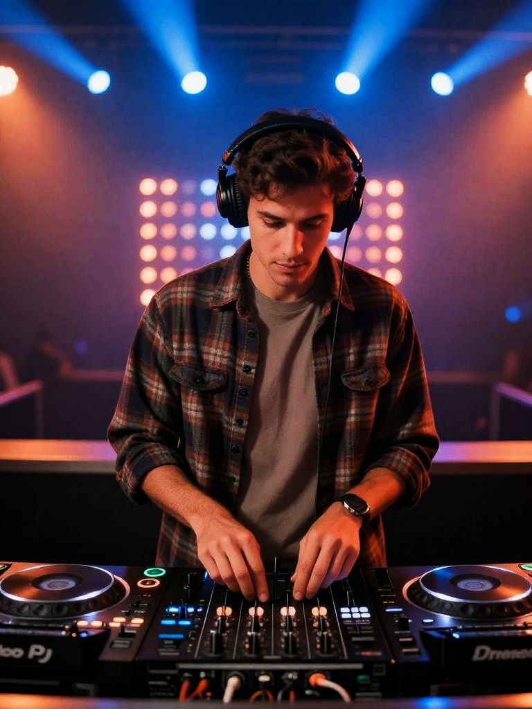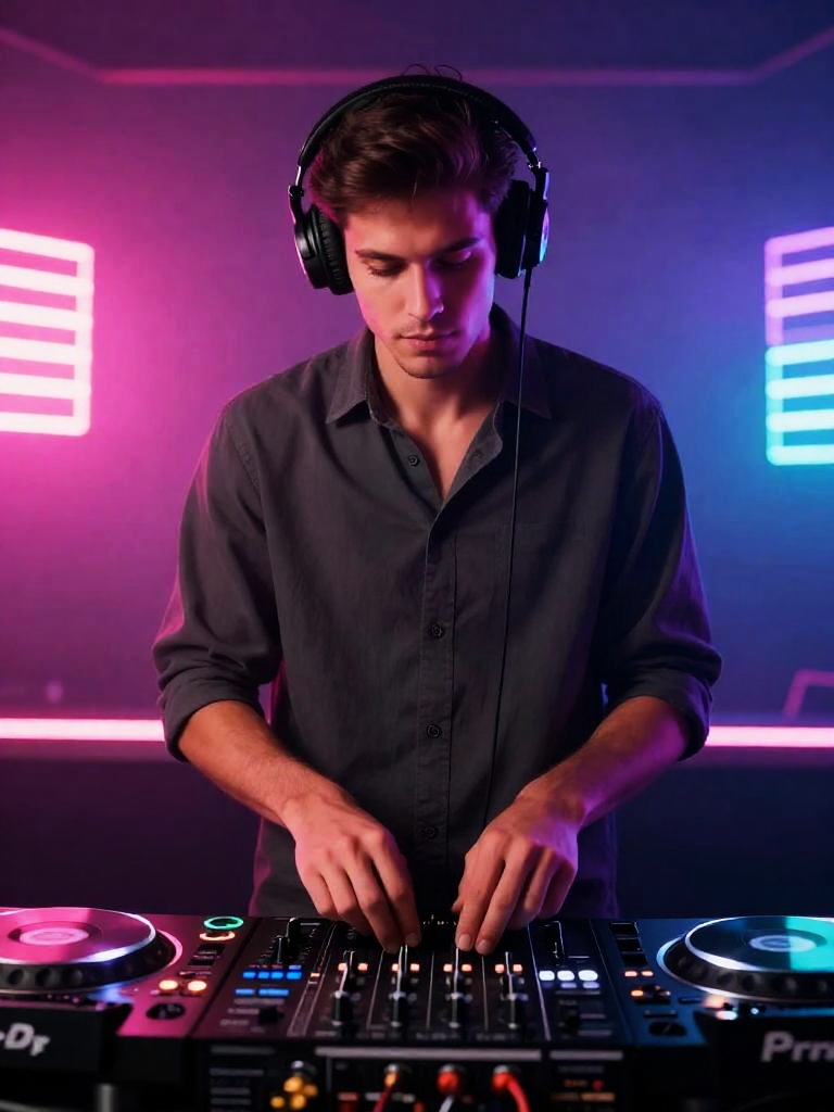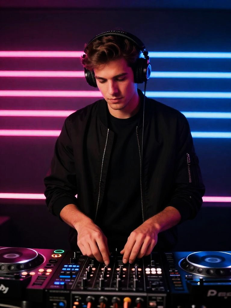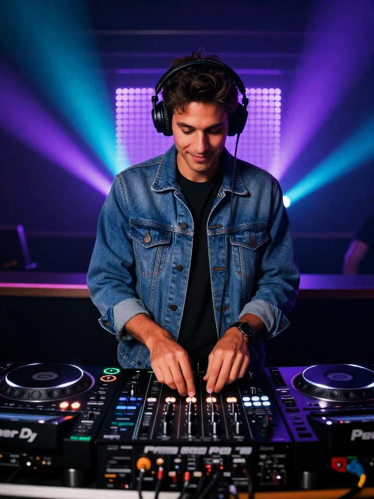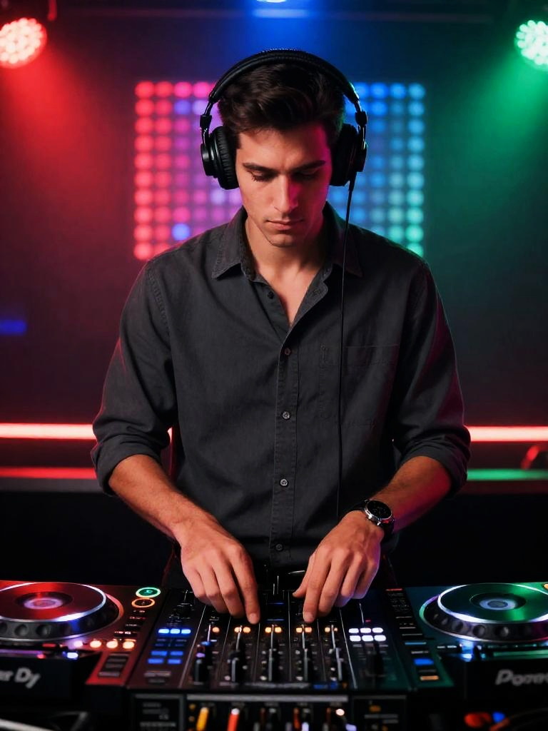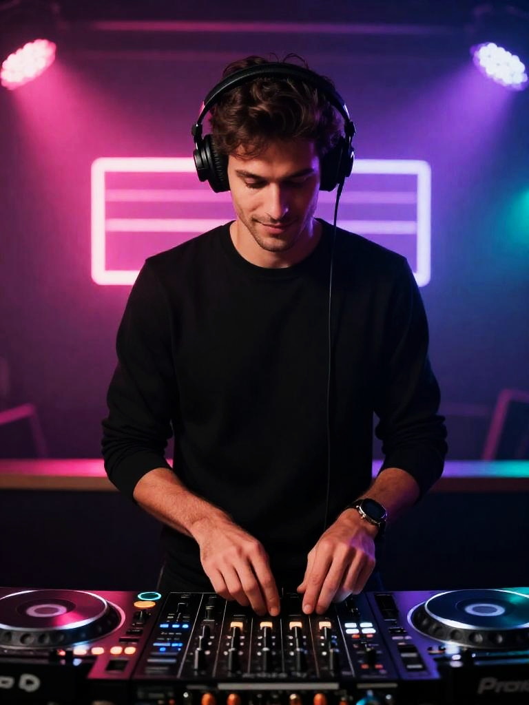 Male DJ in a club, dark-skinned man with close-cropped hair and strong jawline wearing sleek fitted black long-sleeve shirt, standing behind a long DJ booth with three decks, both hands on the mixer as he looks down at the controls, headphones over his ears, vibrant electric blue spotlights with warm orange accents and glowing LED panels in the background, cinematic nightlife scene, realistic, ultra-detailed