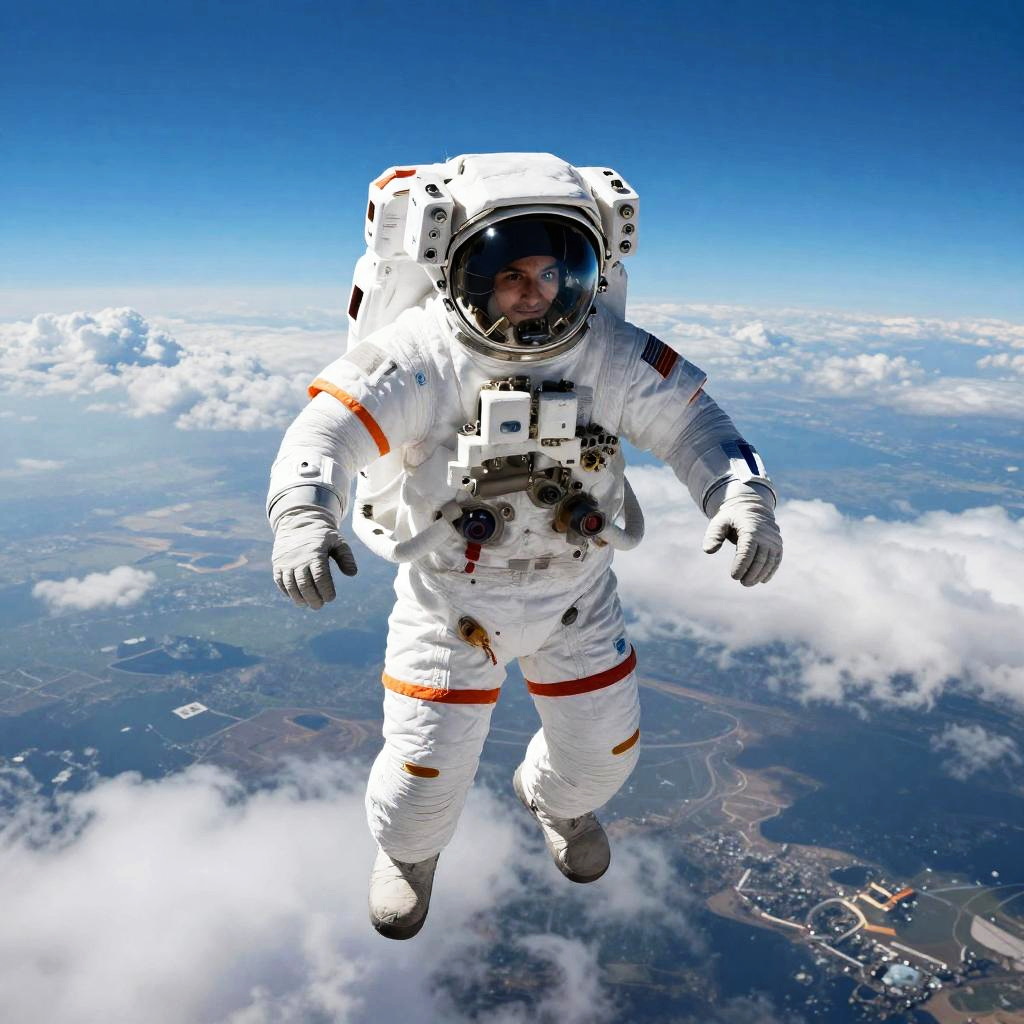 Photograph of an astronaut floating in space, wearing a white spacesuit with orange stripes and a reflective visor. The astronaut is surrounded by a vivid blue sky and fluffy white clouds, with a detailed view of a distant landscape and rivers below. The suit has visible patches and textures, and the astronaut's face is partially visible through the clear visor. The image captures a sense of weightlessness and the vastness of space.