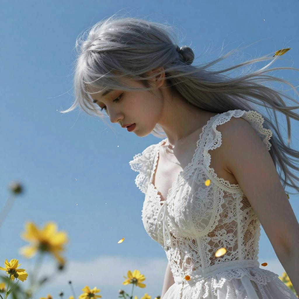 Super fine illustration, masterpiece, best quality, {beautiful detailed eyes}, 1girl, finely detail, Depth of field, 4k wallpaper, bluesky, cumulus, wind, insanely detailed frills, extremely detailed lace, BLUE SKY, very long hair, Slightly open mouth, high ponytail, silver hair, small Breasts, cumulonimbus capillatus, slender waist, There are many scattered luminous petals, Hidden in the light yellow flowers, She bowed her head in frustration, Many flying drops of water, Upper body exposed, Many scattered leaves, branch, angle, contour deepening, cinematic angle, {{{Classic decorative border}}}