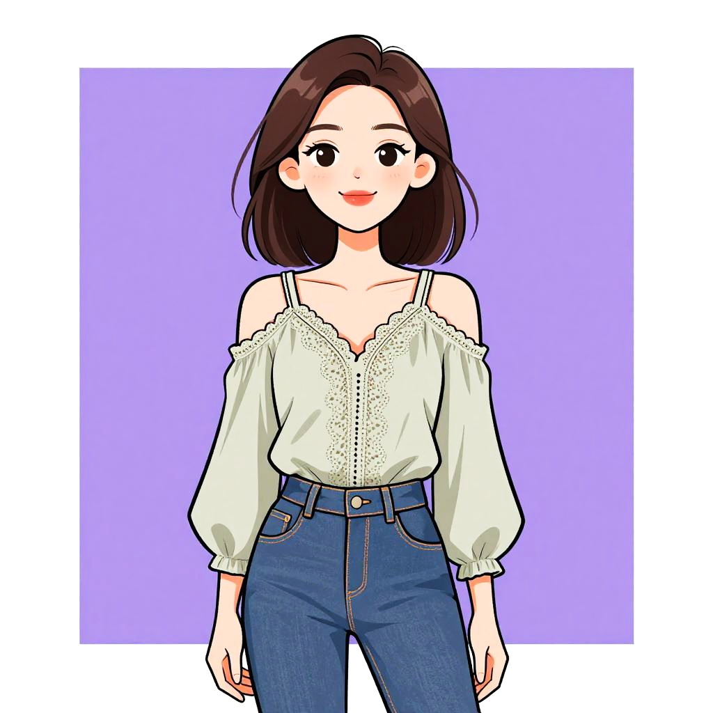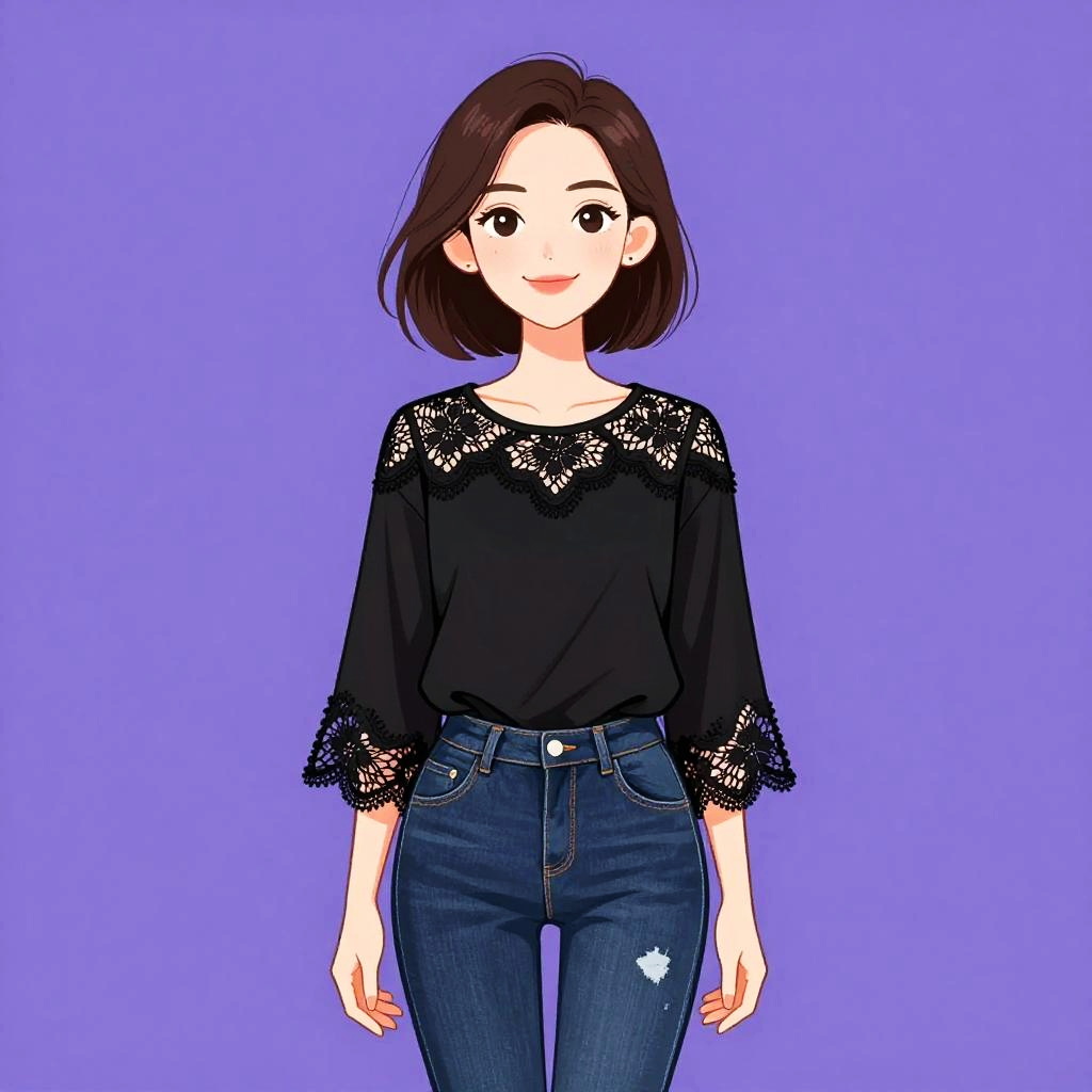 Woman with pretty face and pretty hair. Woman, casual chic, black loose-fitting blouse with long sleeves, scoop neckline, lace trim at the hem, fitted dark blue denim jeans, mid-rise, sleek hair, minimal makeup. --sref 1467
