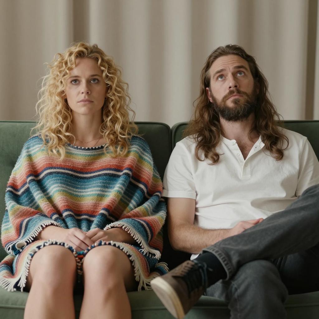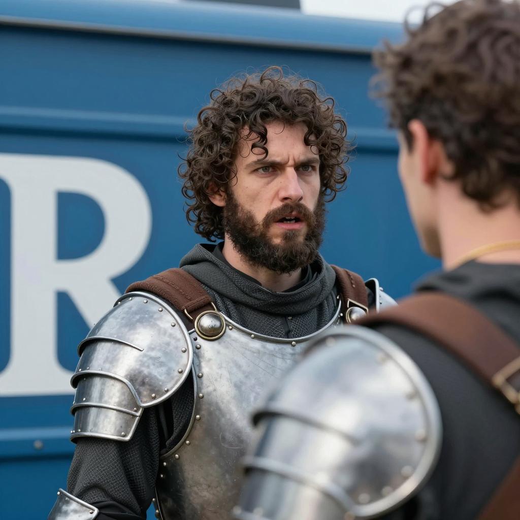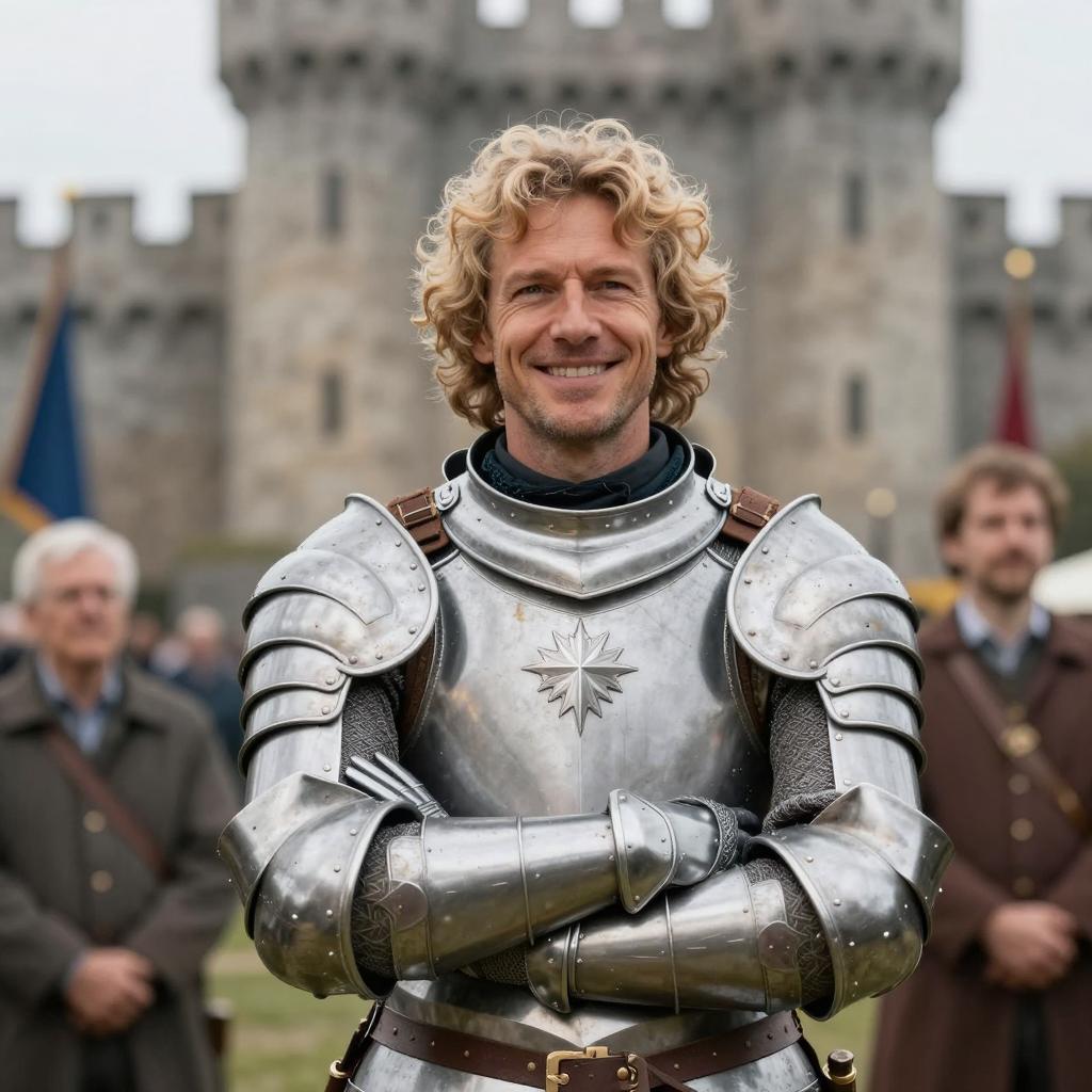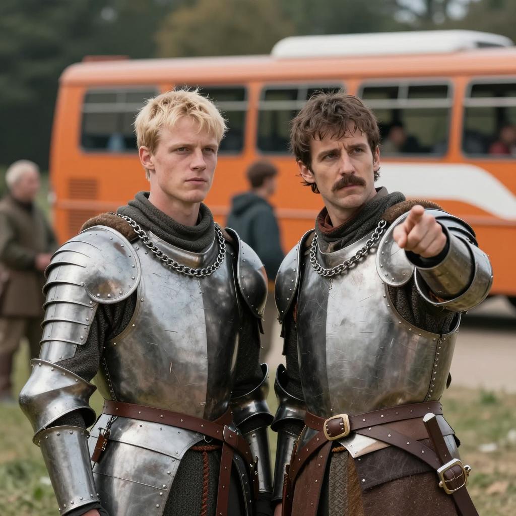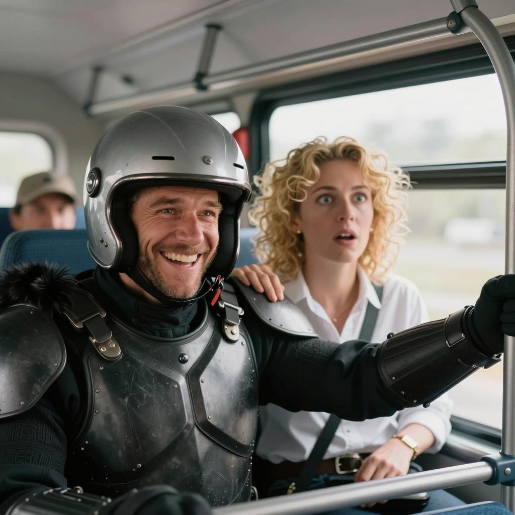 A photograph of two people on a bus. The man in the foreground wears a shiny silver helmet and black armor with a fur collar, smiling widely. The woman behind him has curly blonde hair, wears a white shirt, and looks surprised. Another person with a beige hat is in the background. The bus has silver handrails and windows. The man's left arm is outstretched, grabbing a bus pole. The woman's right hand rests on the man's shoulder. The man's face is in the left foreground, partially blurred.